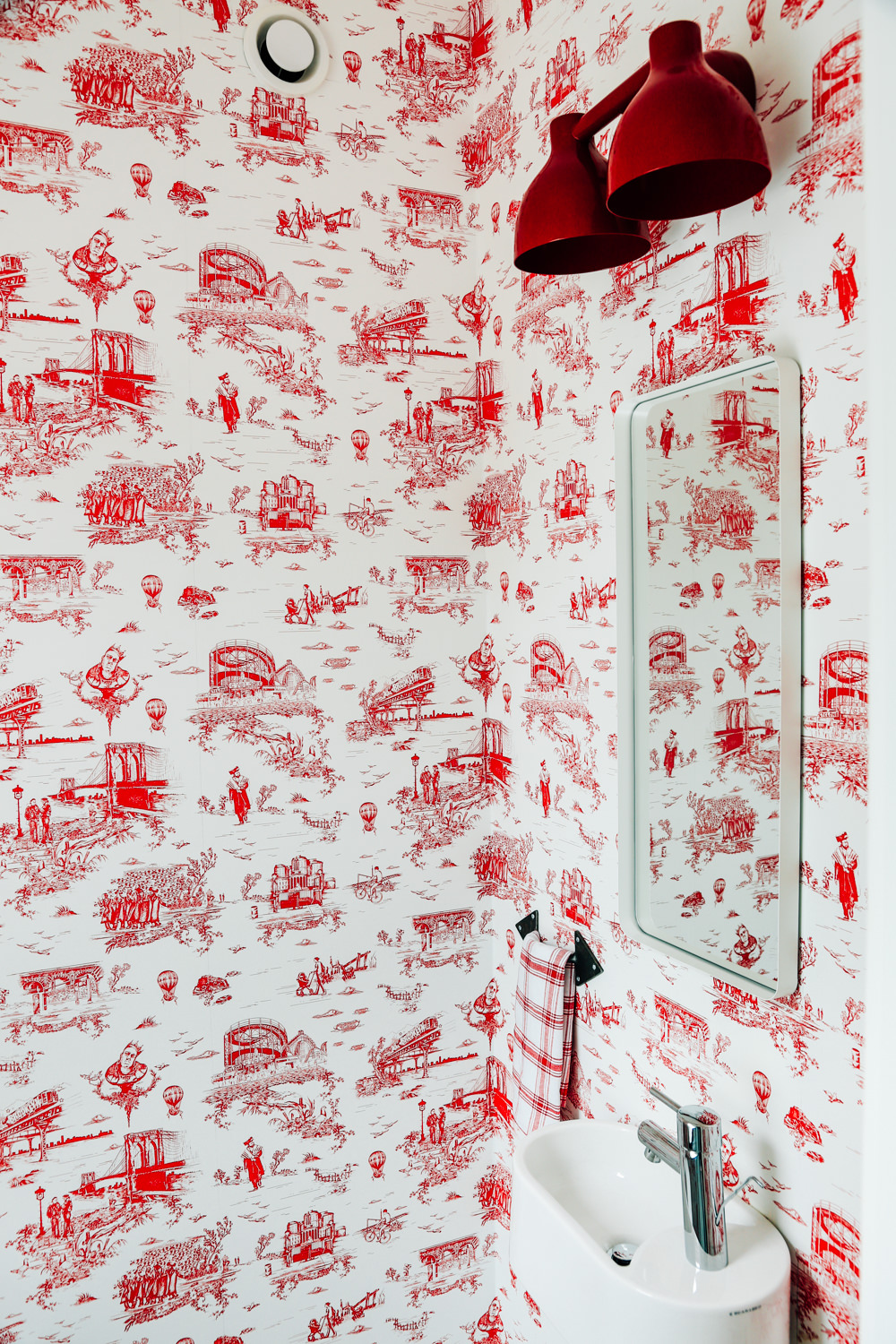 “I’d seen this wallpaper a million places and have always really loved it,” says Karu. “When we decided to wallpaper the bathroom, she was like, ‘If we’re going to do it, let’s just go for it.’ Being that she’s from New York, we thought that the Brooklyn toile was pretty perfect.”