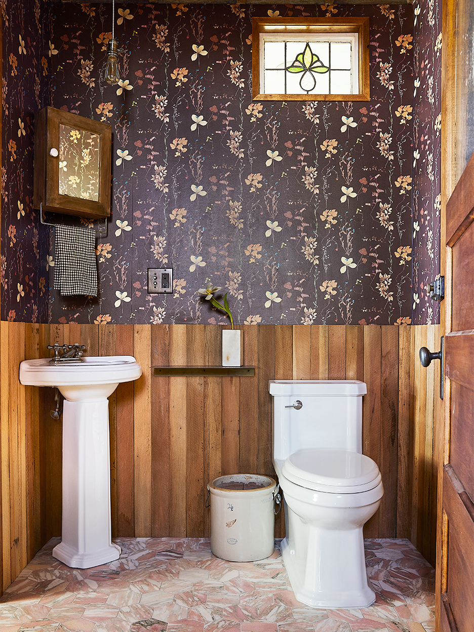 The chocolaty brown backdrop of the Paola Suhonen–designed wallpaper plays nicely with this rural Minnesota home’s dark wood paneled walls and rose marble mosaic tile floors.