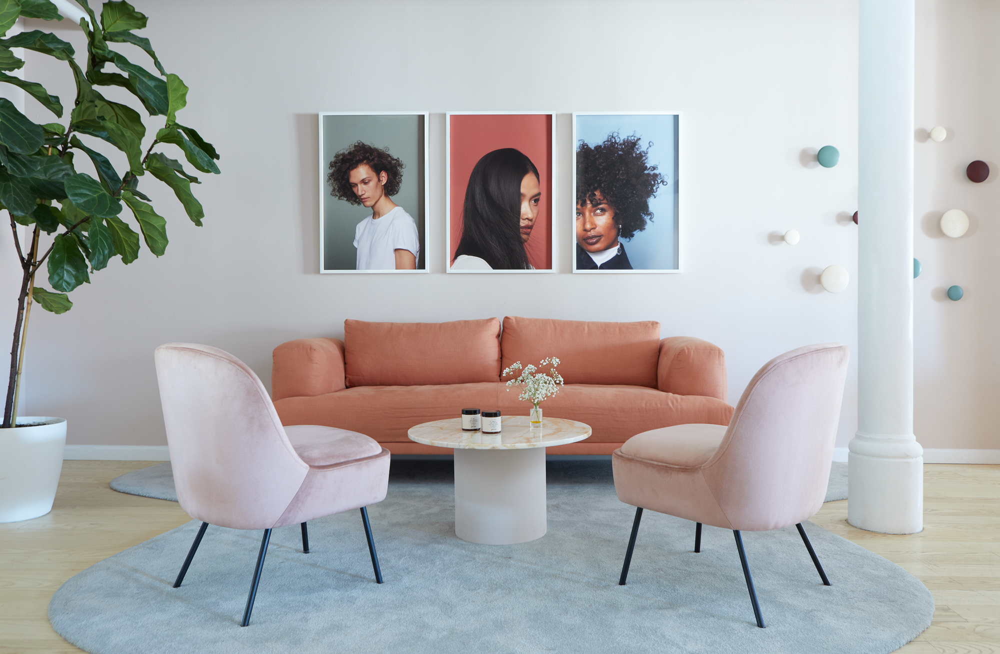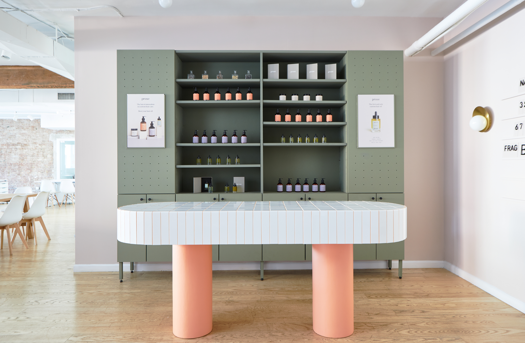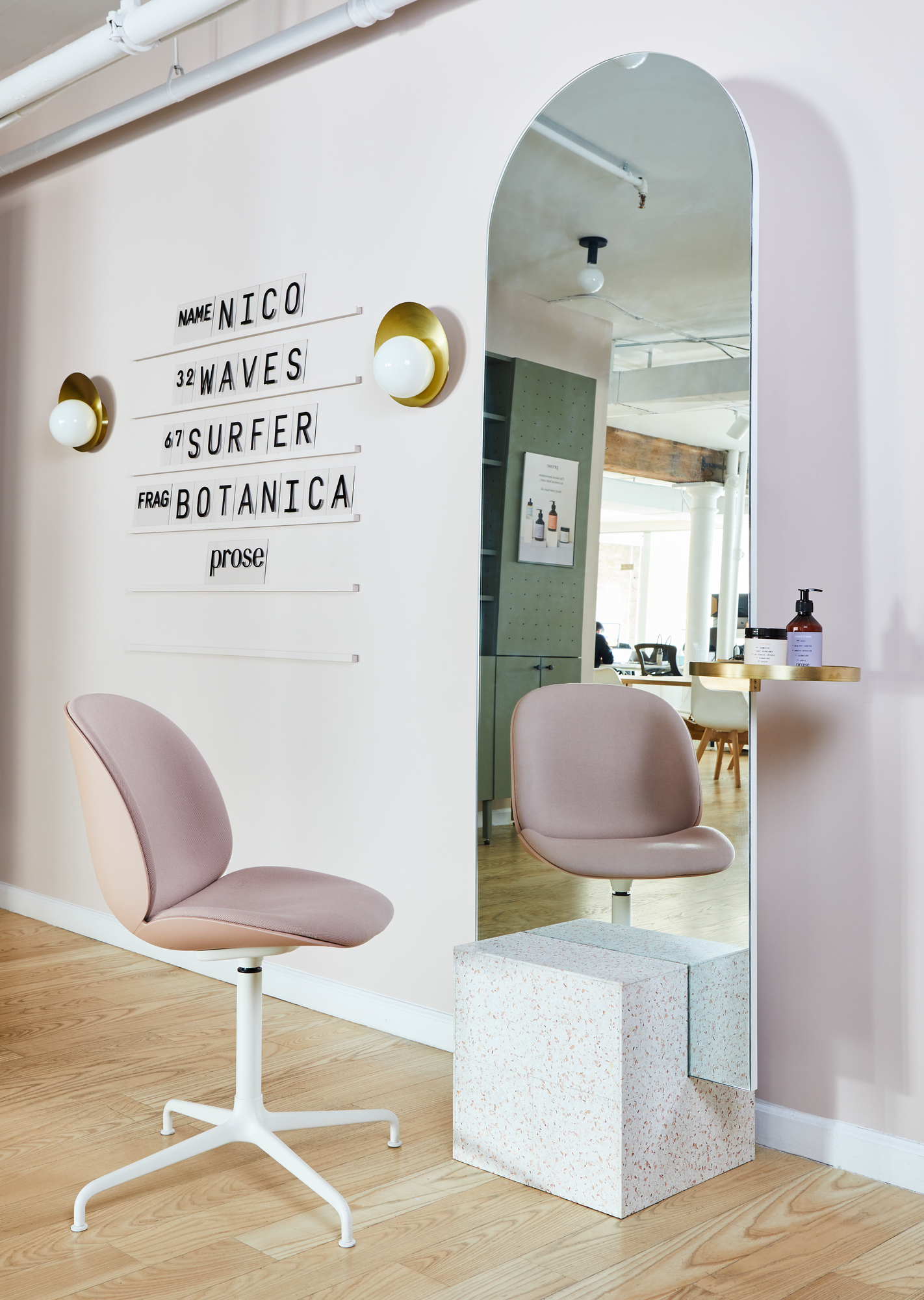 Thus, it only seems fitting that the startup’s NYC office reflects its made-to-order motto. Part office, part showroom, and part salon, Prose recently tasked Homepolish designer Tina Rich to turn their SoHo workspace into a breezy beauty paradise.