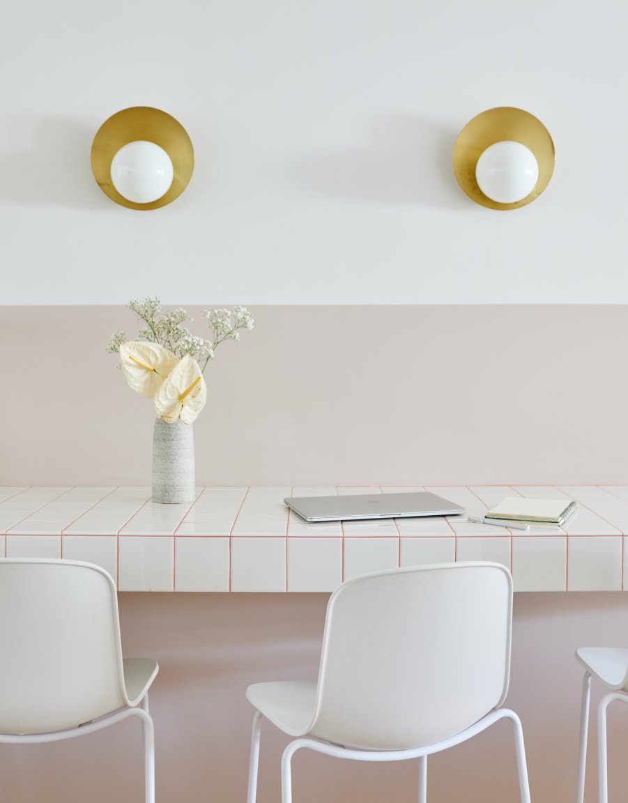 Tiling isn’t just for bathrooms or kitchen backsplash anymore. In the main display area, Rich designed a custom tiled table on two perfectly peach legs to act as a station for hosting tutorials and mixing product. Read between the lines and you’ll notice that the not-so-usual standing desk boasts a special detail.