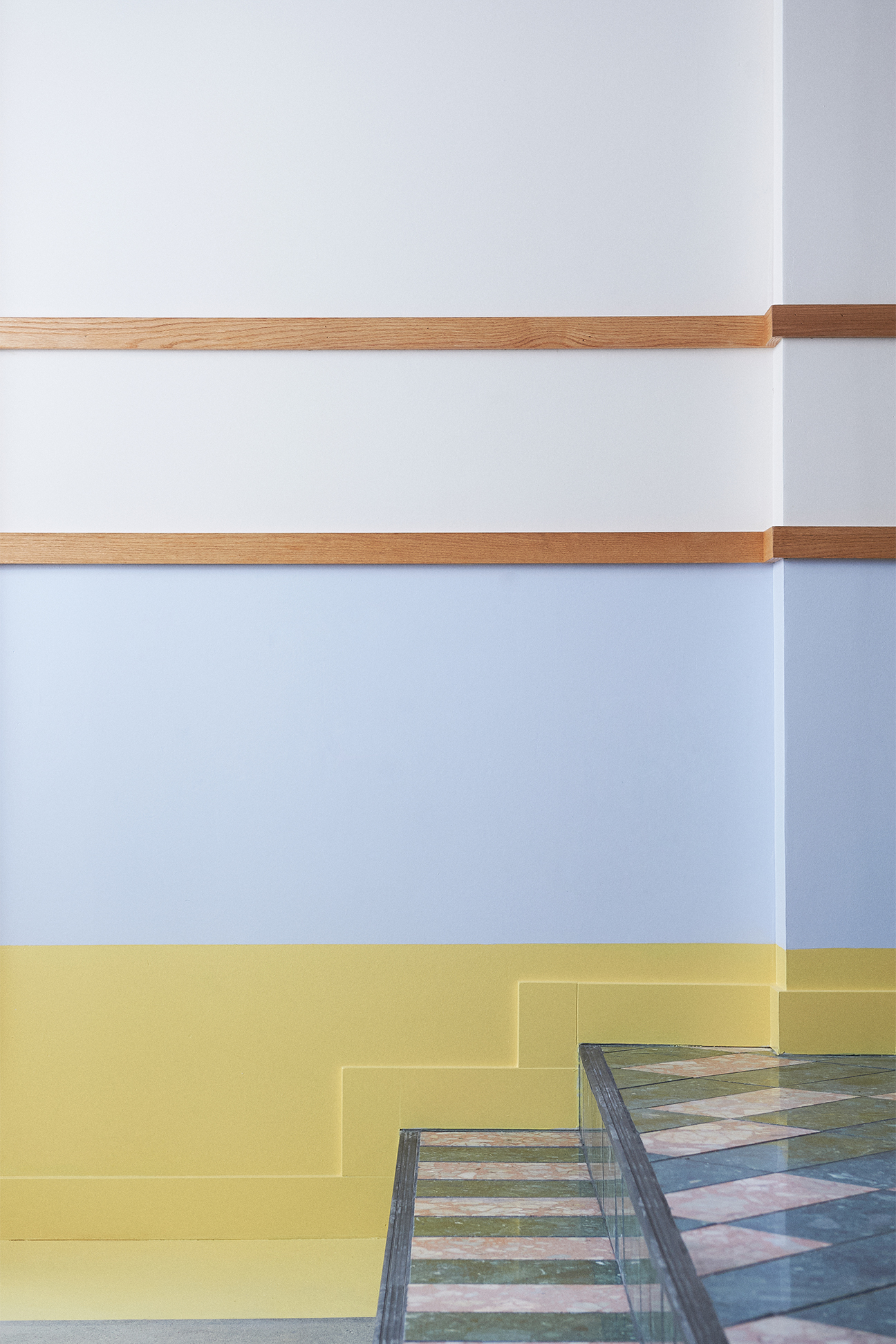 In order to stay within the client’s budget, Snyder and Macdonald had to get resourceful with their supplies. Instead of swathing every last surface in paint, the team explored smaller color-blocking treatments: Snippets of yellow flow up from the floors and onto the wall, while fragments of lavender and baby blue flow up and around door frames and mirrors. In the waiting area, they painted a giant circle—the peachy hue picks up on the pink shapes in the Cold Picnic rug.