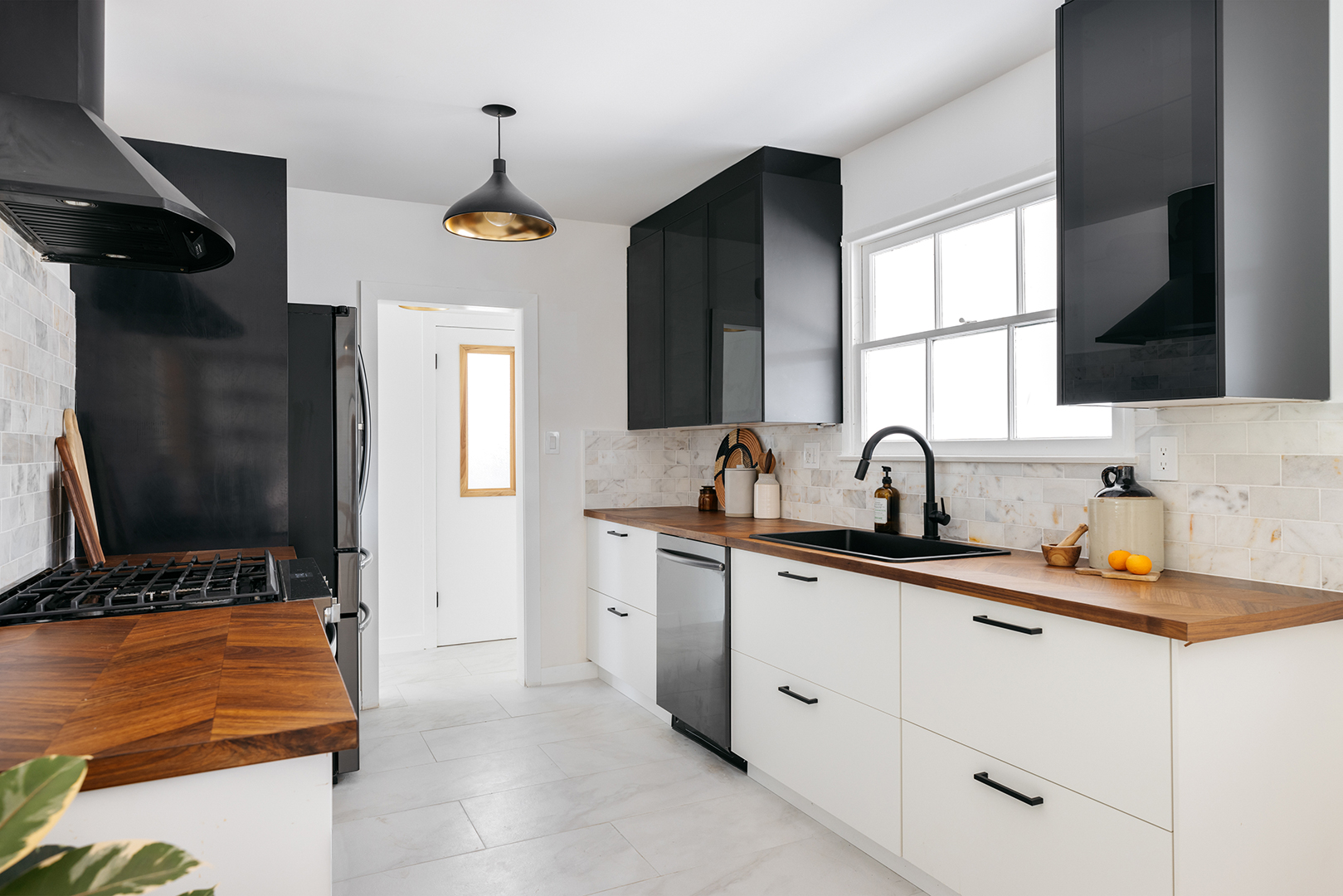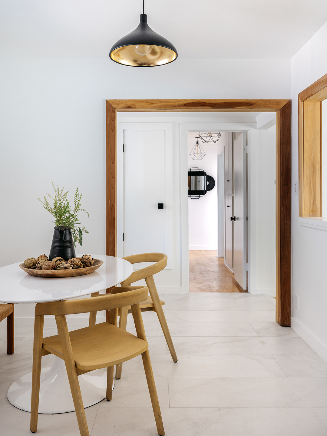 Removing the wall that separates the kitchen from the living area was not an option for a few reasons. The barrier was structural, so the designer would have had to splurge on a new metal ceiling beam if she wanted to take down the whole thing. Plus the job would have meant finding a seamless way to blend the wood floors in the living room with the porcelain tile in the cooking zone. To avoid a major headache, Burgos doubled the size of the entrance to the kitchen and created a cutout in the structural wall to take advantage of the lush backyard views. “When you come in now, it feels nice, bright, and big, even though it’s still a galley kitchen,” she shares.