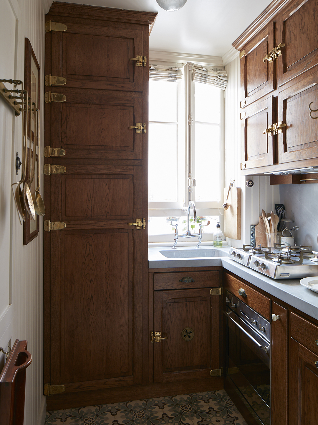 Affuso and Badesco were “very lucky” to find original finishings and only introduced new tile in the bathroom and kitchen, where they designed the oak cabinets themselves using wood sourced from old French shop counters. The Smeg appliances complement the vintage aesthetic, and Carrara marble counters feel solid and stately.
