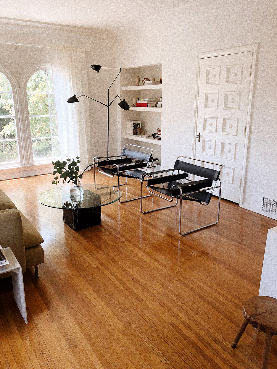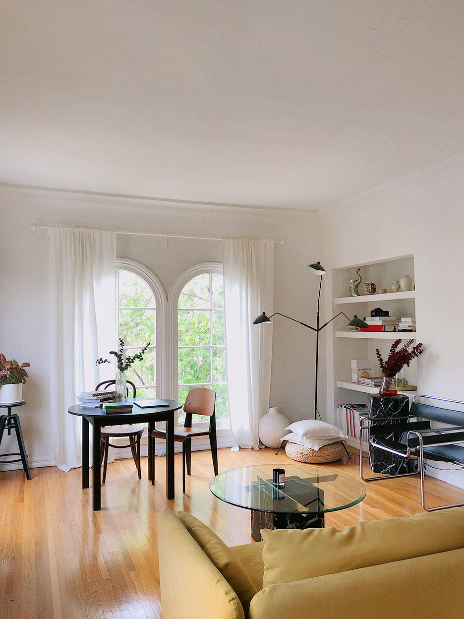 Isabelle Dimang is no stranger to change. After leaving New York in pursuit of warmer weather and continuing a career in fashion (she’s currently a photo director for Nordstrom) seven years ago, the Arizona native settled in Los Angeles’s Hancock Park neighborhood. Her 1920s, Art Deco–style apartment boasts enough character to last several lifetimes (think: a turquoise tiled bathroom, arched windows, and original crown molding), but her living room layout is constantly evolving. Dimang moves things around every few months for a fresh dose of inspiration.