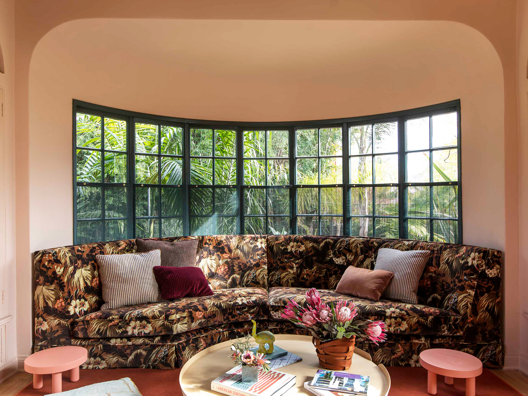 A trio of vintage Togo seats in the new living space, found in Europe in their original brown floral velvet, was just the beginning of Merrill’s daring fabric choices. At the end of the room is a rose-hued lounge, which appears to glow from the inside out. At the heart of it: a curved sectional upholstered in a tobacco-colored botanical velvet from House of Hackney. “There’s something about old patterns and this rich color that gives the room depth,” she explains.
