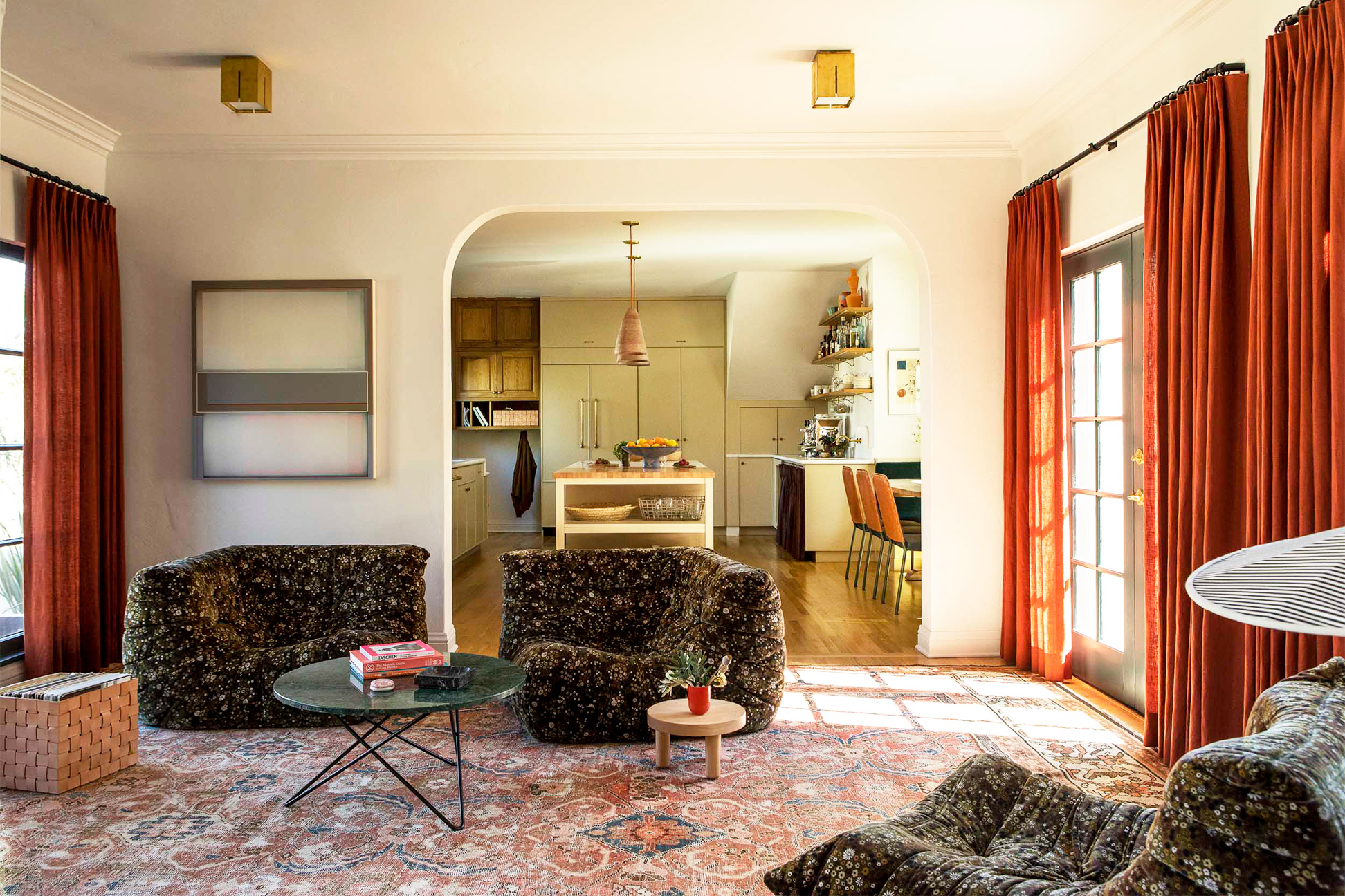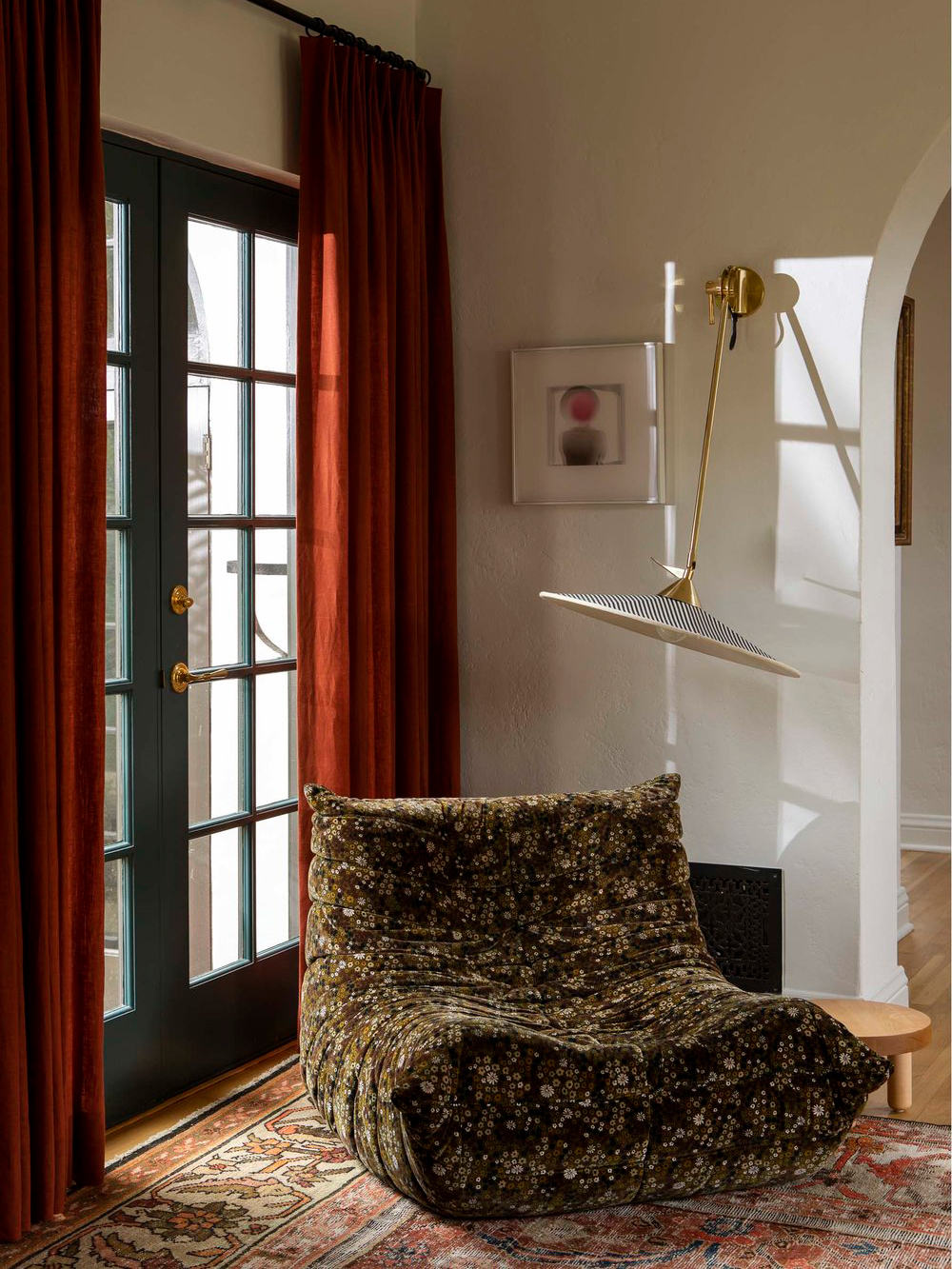 The windows are lined with semi-sheer drapery to softly filter the light: soft ochre paisley in the kitchen, a warm flax linen in the bedrooms, and burnt orange in the den. For most people, curtains are simply a necessary component that ensures privacy when you want it and allows you to sleep in when the sun comes up. But for Merrill, they’re an opportunity to give each room its own mood. McKuin was skeptical at first, but it’s those details that are now her favorite part of the house.