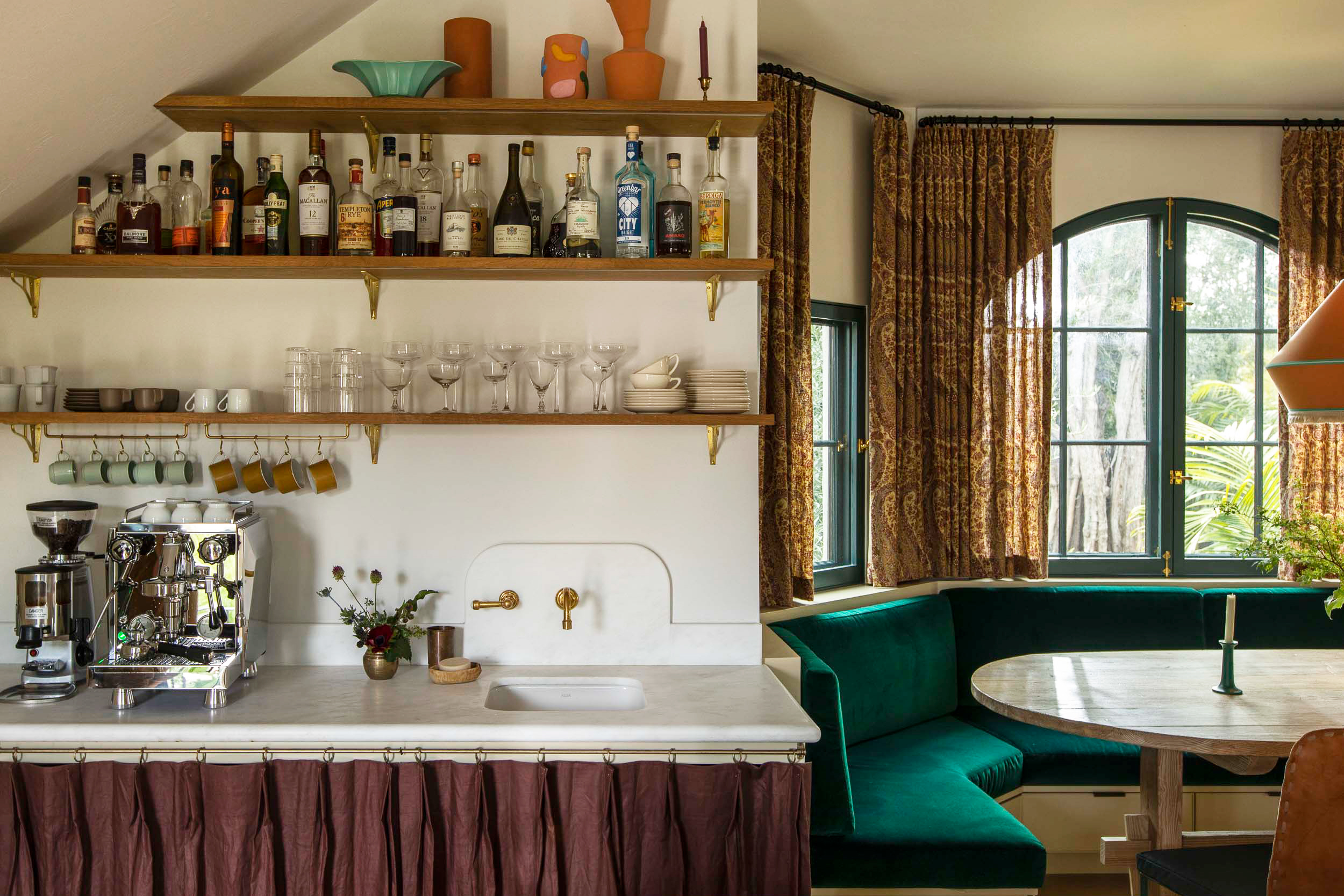 Merrill doesn’t turn to trends. She prefers looking at old books and magazines from other time periods so she can see how people lived in previous decades and reimagine those ideas for 21st-century life. In the kitchen, she kept the finishes timeless. Brass faucets, a curved white marble backsplash, glazed ceramic tiles, and plum linen sink skirts ensure that even though the flow of the space was undeniably modern, it looked like it could have been there for decades.
