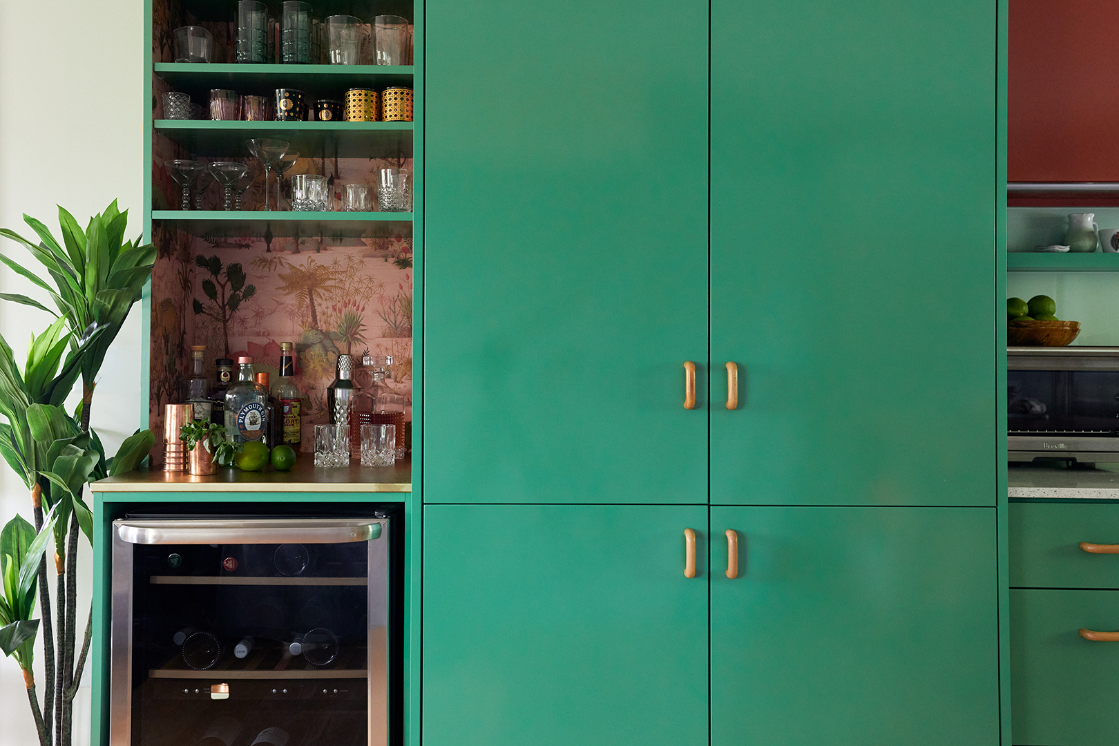 Where there was once a door leading to the garage, there is now a built-in bar nook with dinosaur wallpaper from House of Hackney—taking the space further off the beaten path. “When we were first brainstorming for the project, Andrea pulled me aside and said, ‘I want to tell you, I’m not afraid of it being a little bit…ugly.’ I knew exactly what she meant,” recalls Sass. While the designer feels like they ended up far from ugly, it was refreshing to be free of the traditional constraints of what defines a beautiful kitchen. Rather than being concerned with how others perceive their design choices, they focused on showing their personalities. “I joke that maximalism is my religion,” says Andrea. Then this is their house of worship.