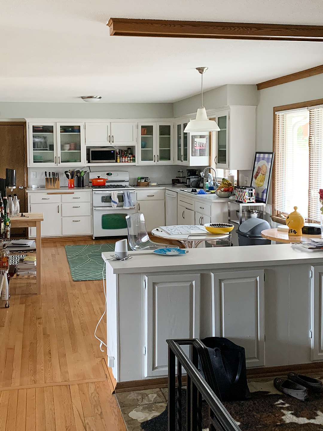 Sass began dissecting several of the outfits and translating them to the space’s new design. “We loved the almost-hospital-room green tones paired with rusty and true shades of red,” says Sass. The retro hues complemented the couple’s vintage tchotchkes nicely, as well as the home’s quirky architecture (the see-through fireplace that separates the cooking zone from the living area is original). “Everybody’s trying to create timeless spaces, and I’m not really a big fan of that. You can’t just remove time from the conversation,” explains Sass. Instead the designer focuses on “timefulness”—the idea of layering nods to different parts of the past. “I think this space works because it’s just being itself,” she notes. Ditching the status quo, here’s how they brought their fashion-forward home to life.