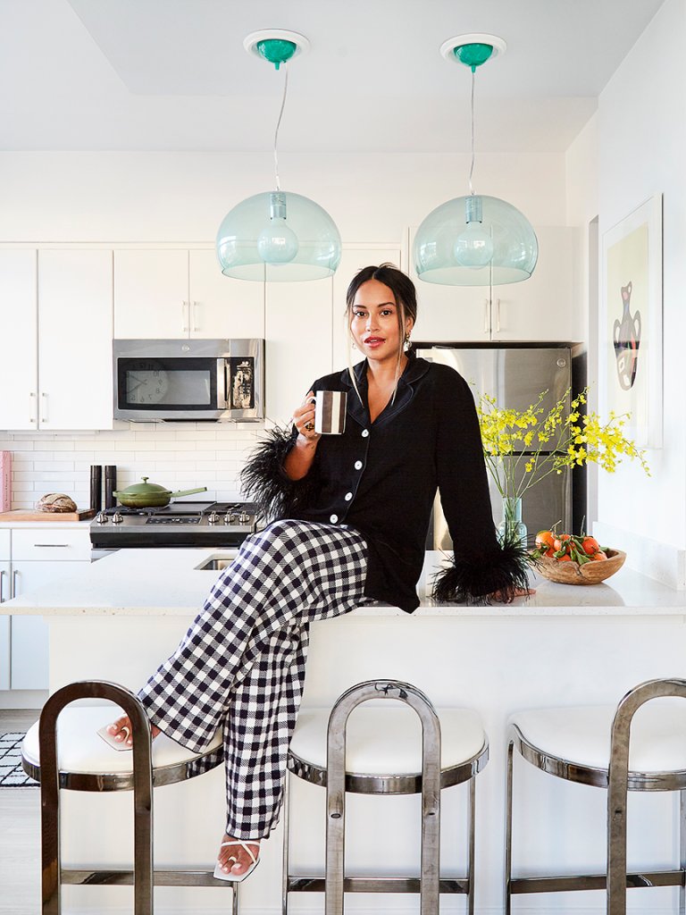 Any accents that weren’t red needed to pack a punch, “or else they would just disappear,” explains Lafitte. “That’s where the black and white came in.” Anchoring the room is the travertine coffee table ($20 on Craigslist), two checkerboard poufs from Morocco (her cat’s and dog’s favorite nap spots), and a series of prints from Paper Collective.