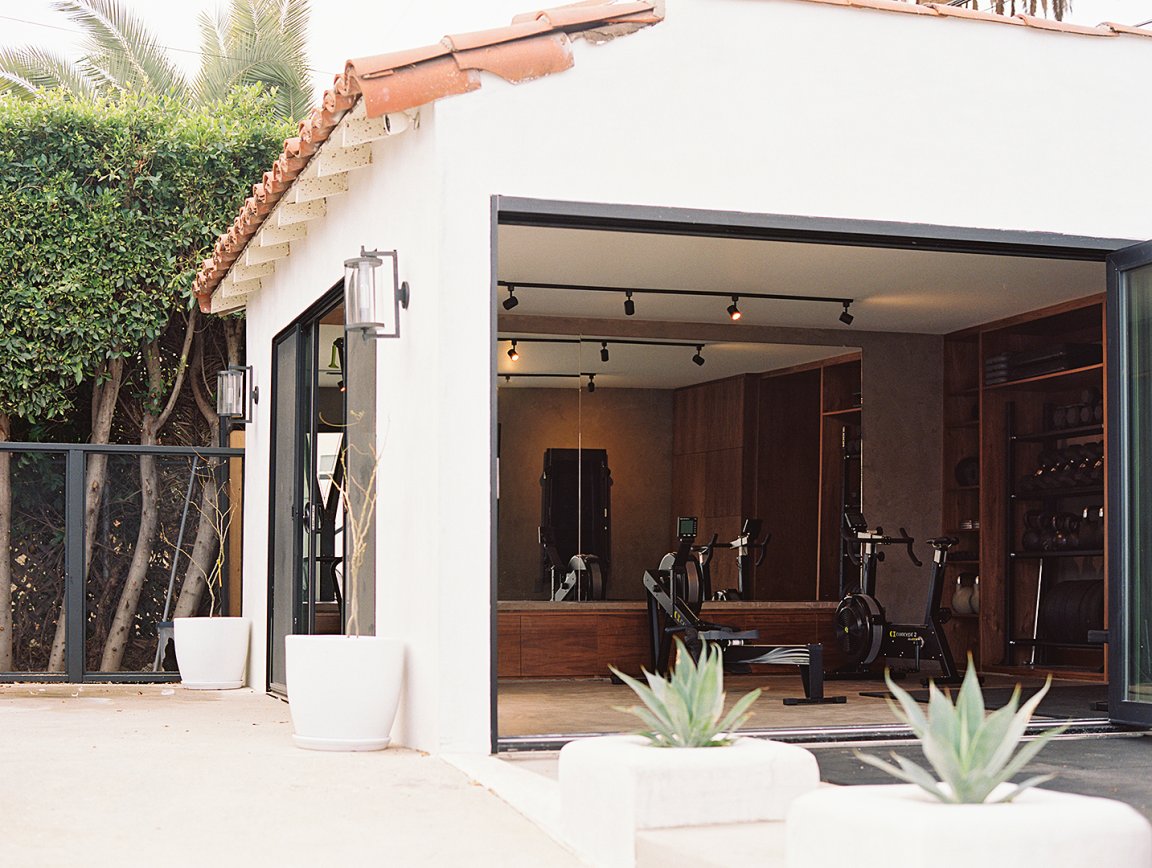 Several half-baked DIY home gyms have come and gone since Ishizuka bought the 1930s home in 2018. Their first attempt to gym-ify the area started with a $2,000 budget and ended up still feeling very utilitarian. “At one point, we were like, let’s do a stripe and make it a Gucci gym, but that’s as far as we could take it,” she says laughing. Finally, in 2021, Ishizuka enlisted a pro to properly revamp the dusty garage into a sophisticated fitness studio.