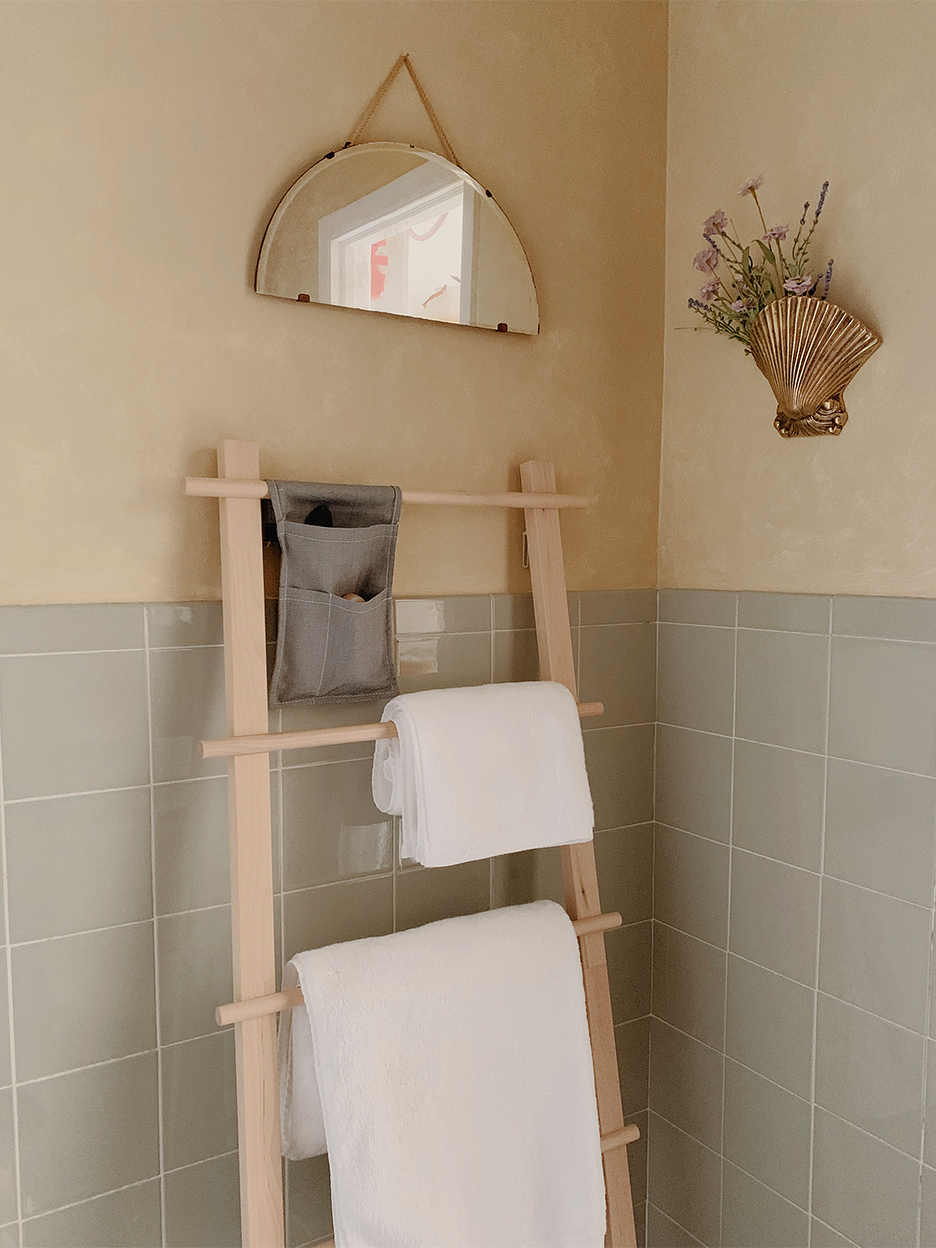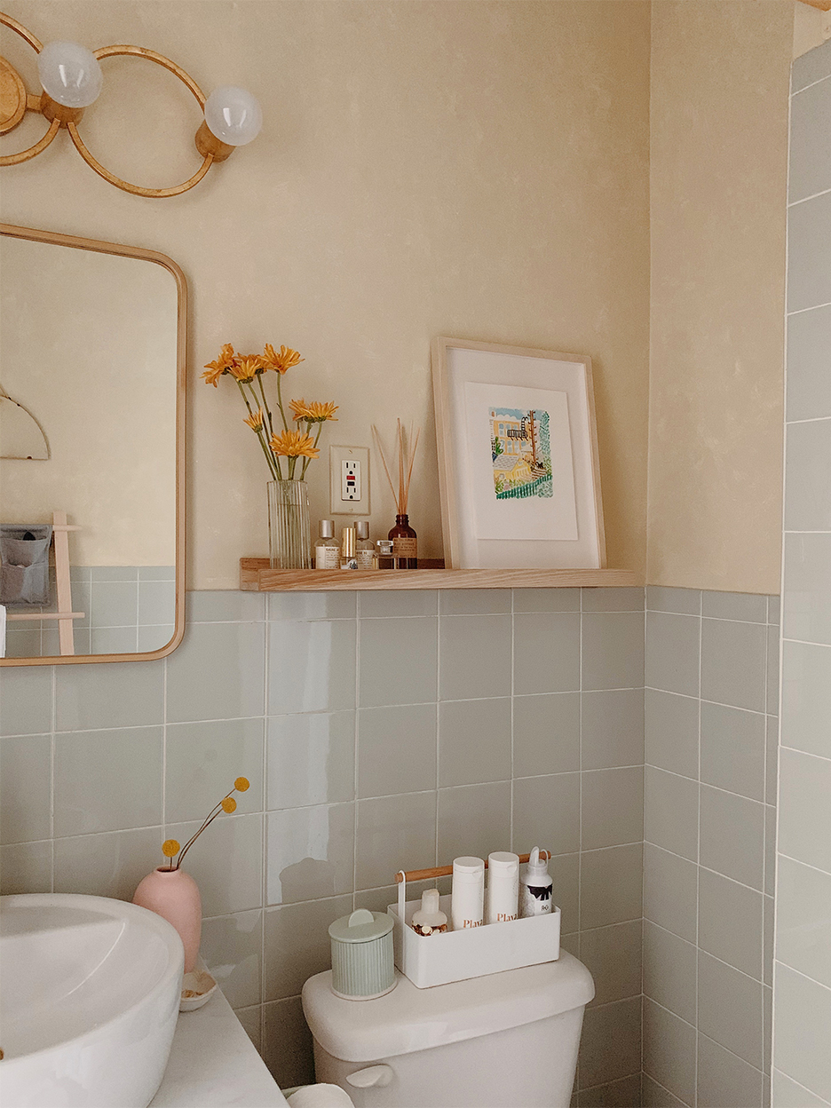 Changing the white walls to beige (Fletchall went with Palo Santo from Backdrop) made the room feel cozier and, surprisingly, the existing square green tiles look more modern. “I never really noticed them much before this makeover, but when we started ripping out the vanity, medicine cabinet, and shower door, I realized how much I love the color and the minimal (and peaceful) look it created all on its own,” says Fletchall. All it took were a few tweaks to uncover the hidden potential.