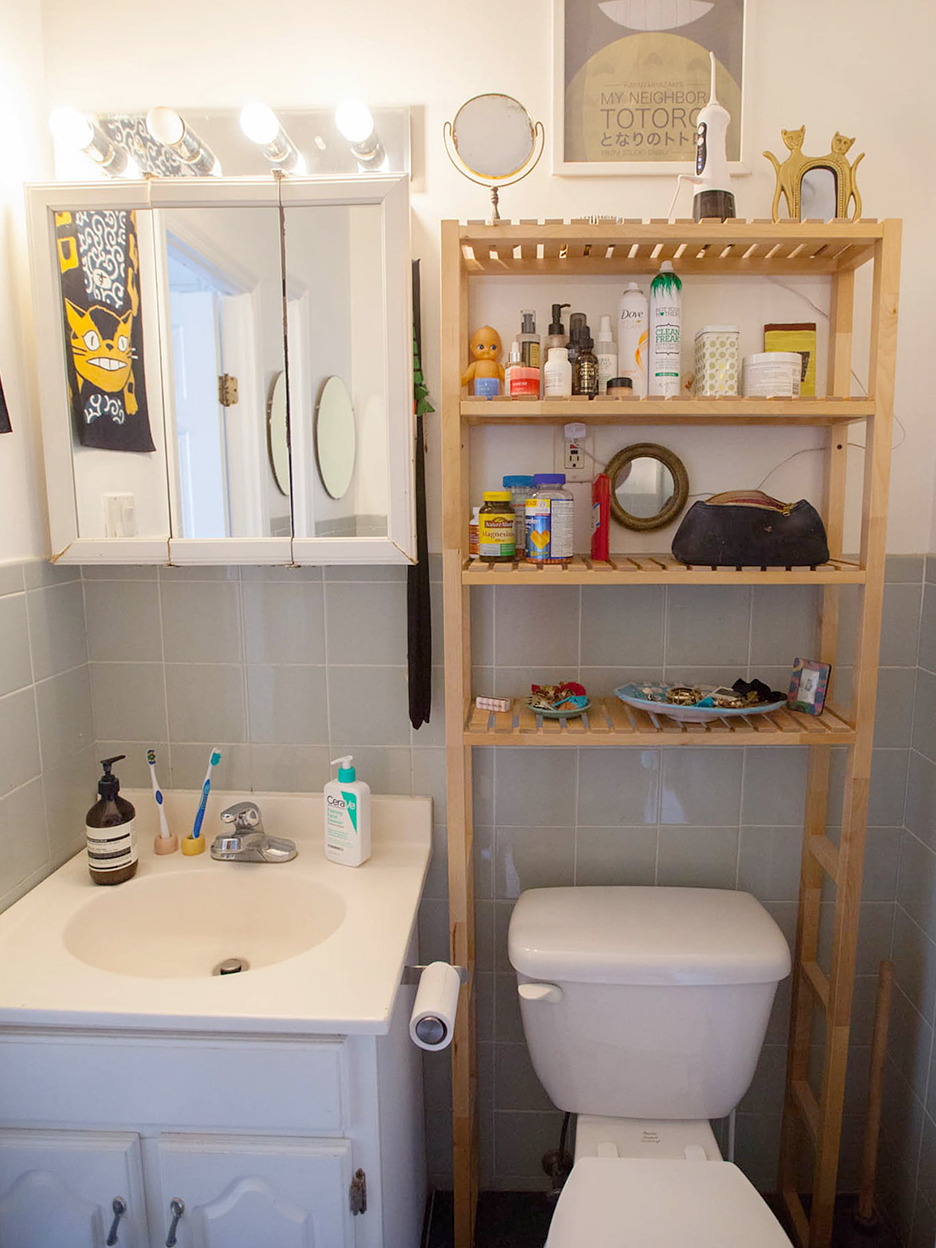 Since moving into their rental five years ago, the only change Fletchall and her husband, David, made to the bathroom was adding some over-the-toilet storage, but looking back she says it made the space appear more cluttered. “The wall tile was the only bit that we didn’t dislike, but it was hard to appreciate it fully with the dingy shower door,” she explains. During the early months of quarantine, they found the time to chip away at the space (they have a very trusting landlord), addressing everything from the minuscule cabinet to the bland wall color.
