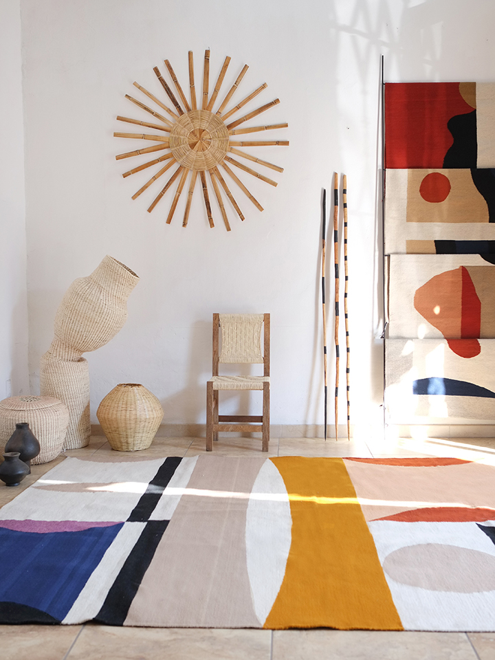 Those first months in 2017, bunking with makers, was a time for him to dive fully into the art of weaving, learn from the masters, and build relationships—ones that would prove to help Reyes finally start the business selling his designs, Rrres, he had been mulling over for years. Now his studio works with an established group of craftspeople to bring his fresh perspectives to life using techniques passed down through generations. All the small-batch, handmade homewares, from his well-known vibrant rugs to ceramic jugs to voluptuous woven palm baskets, feature Reyes’s signature graphic shapes and curves—and honor the country’s lost practices.