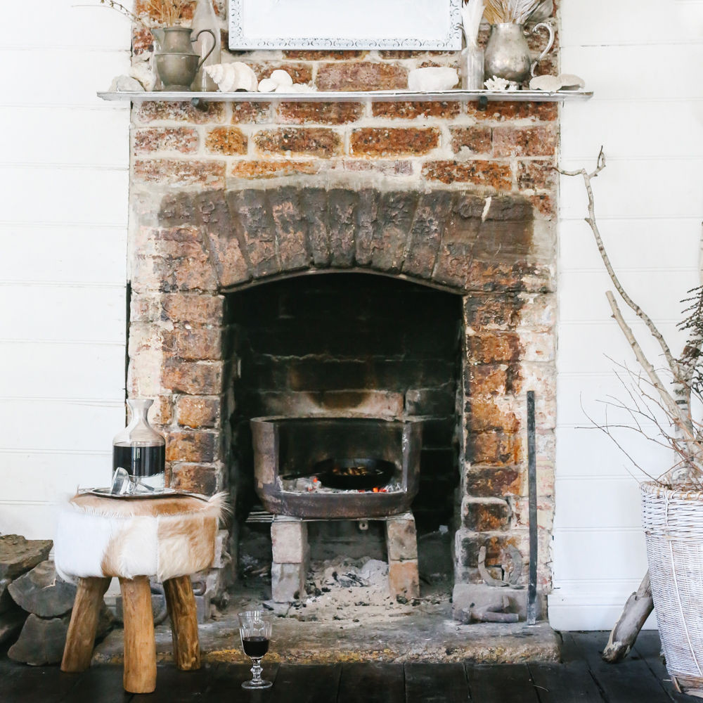 A chic side stool fits right in with this rustic fireplace featuring an exposed brick surround.