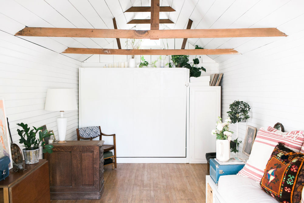 Inside this tiny bungalow, wooden ceiling beams accentuate the frame of the living room, paving the way for the rustic items and decor.