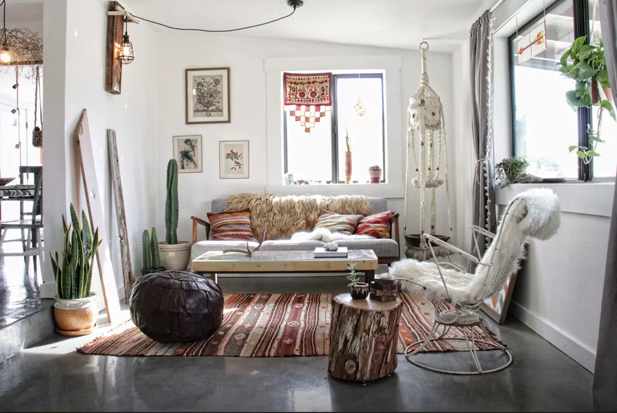 This eclectically vintage living room features a more dynamic take on the rustic scheme with its slew of inspired items.