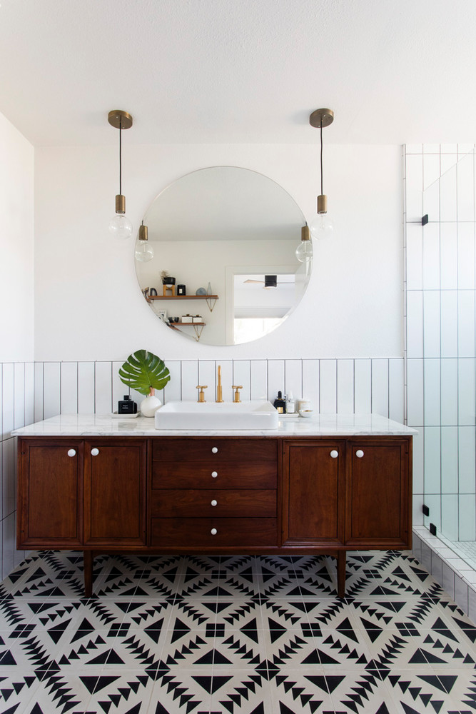 Knowing that the graphic tile she had selected for the master bathroom would bring a sense of business to the space, the designer pared down the overall look and palette of the room, opting for a simple mid-century-inspired vanity and sleek vertical subway tiles.