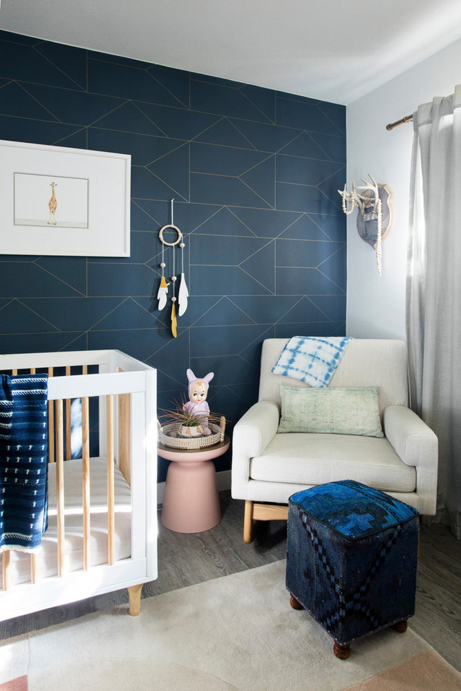 In her daughter’s nursery, Naber wanted to avoid cliches by taking a more contemporary approach with the Scandinavian-style crib and moody, metallic wallpaper.