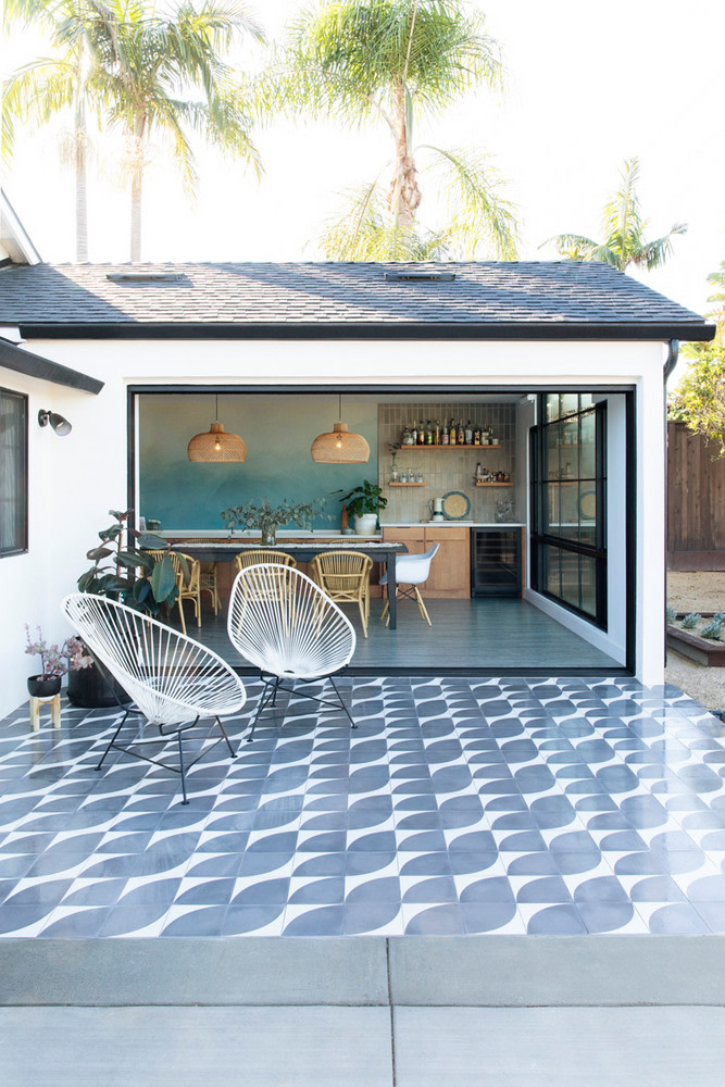 Going beyond plush throw pillows, her eye for pattern translates to almost every surface in the home—from the bathroom floor to the backyard patio.