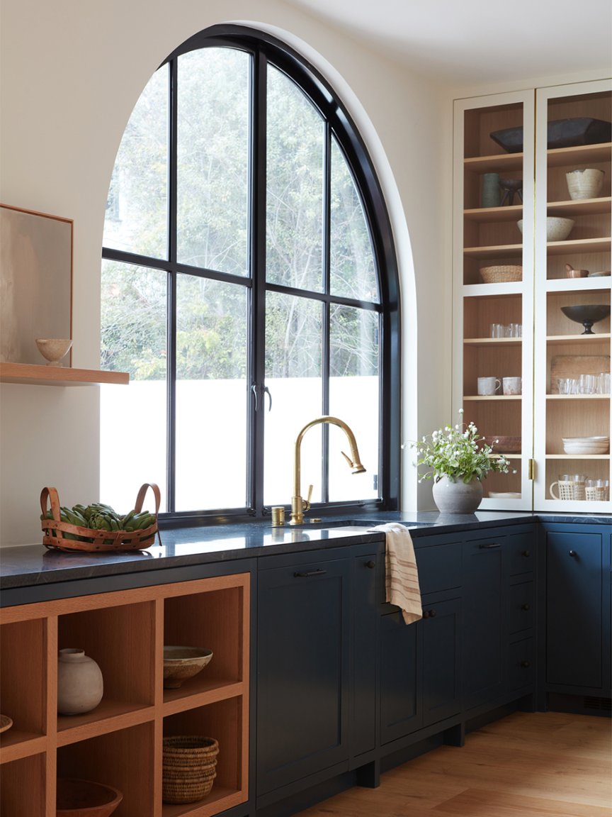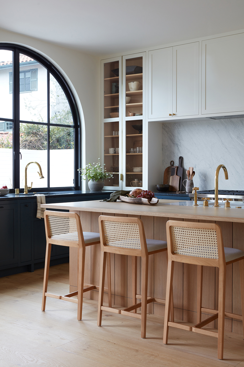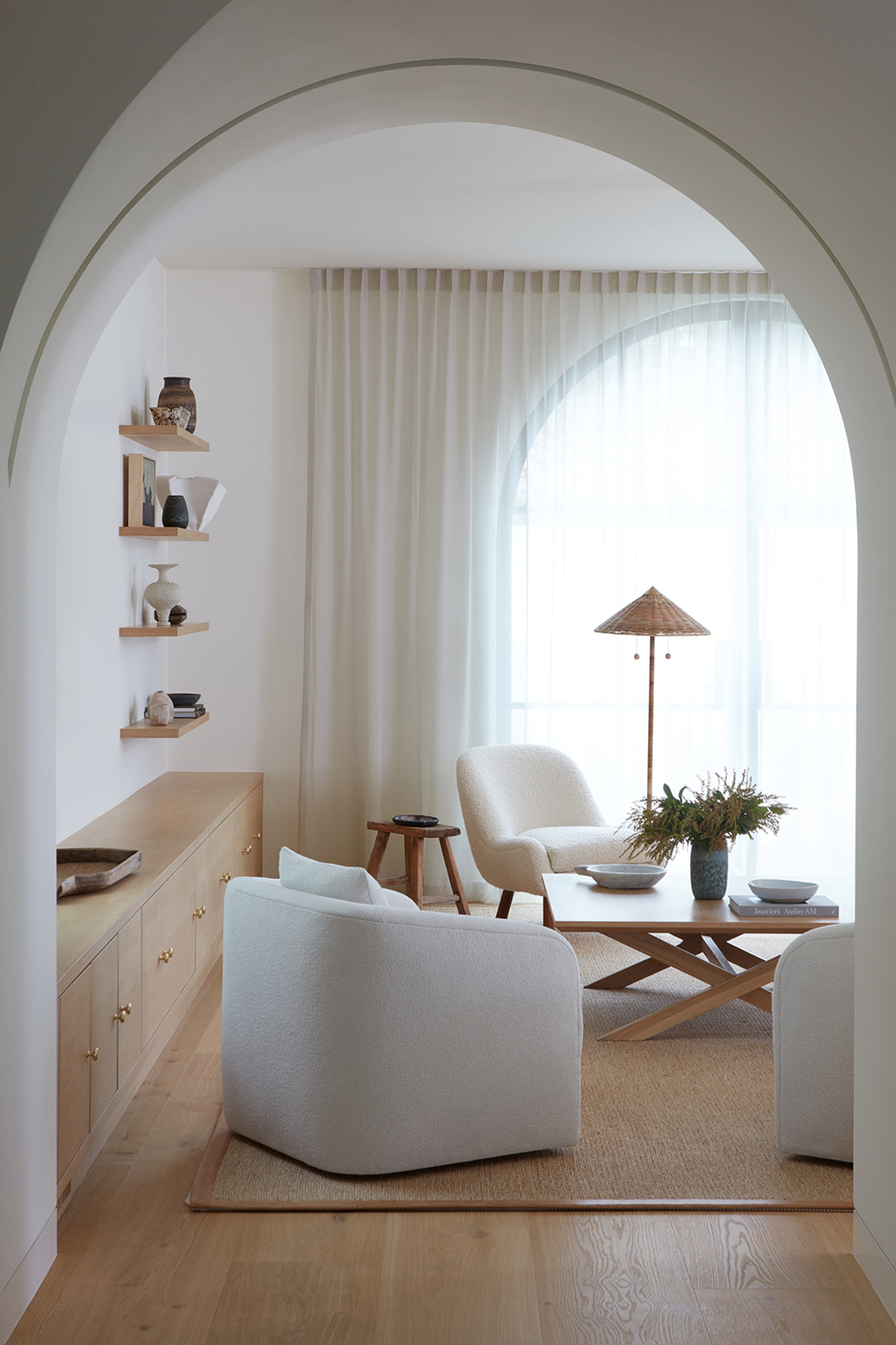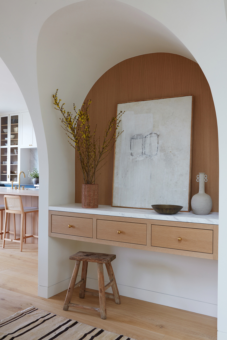 A large arched window by the sink doubles as an outdoor bar on the other side and softens the architecture, one of two main design throughlines in the house. The other, oakwood details, is found in almost every room. Here, it’s in the form of open cubbies tucked in the lower cupboards for bowls and cookbooks. Across the room a low-slung media cabinet with floating shelves in the same material creates cohesion between the two spaces.