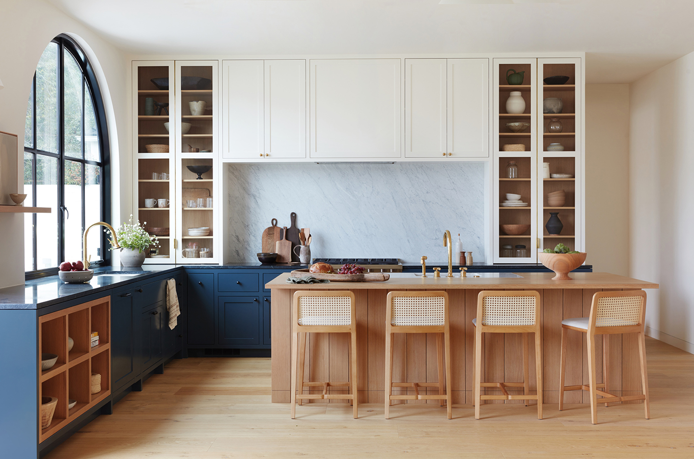 At the top of Lewis’s must-have list, though, was a large kitchen that opens to a family room, where the family could watch TV while she cooked. They called on Annie Ritz and Daniel Rabin of And And And Architecture Studio and Caroline Schoppe and Lexie Sokolow of Studio LifeStyle, respectively, for help—and a creative push. “I’m very grateful that the architects had the vision for colorful things, because I want everything to be all white, and the navy cupboards really add to the room,” says Lewis. One nonnegotiable, however, was the glass doors on her upper cabinets, in which she wanted to display her favorite dishes. Lewis organized her stash inside from most frequently used serveware at the bottom to occasional pieces at the top.