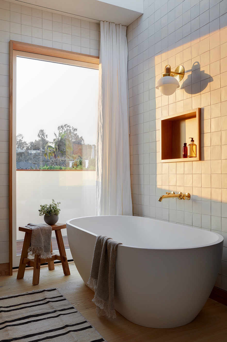 Ritz and Rabin continued the hardwood floors into the master bath to keep the eye on the view out the picture window, which offers a glimpse of the ocean from the skylit bathtub. A wall nook, framed in signature oak, holds bath essentials. “I had never been a bath person, but I’ve definitely become one now,” says Lewis. “I can close the two doors and no little people can get to me. It’s very quiet and peaceful.”