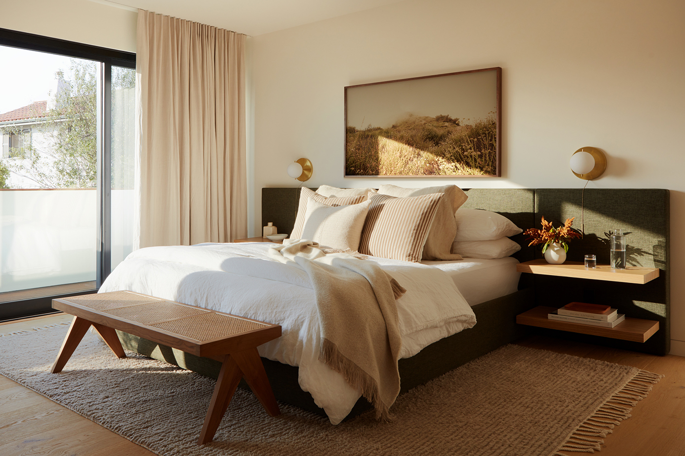 White oak did make it to the main bedroom, though. Sokolow imagined a large muted green bed frame with built-in wood nightstands to anchor the space. “A lot of our clients want to have storage, but they are very minimal; we were able to do these open shelves,” says the designer.