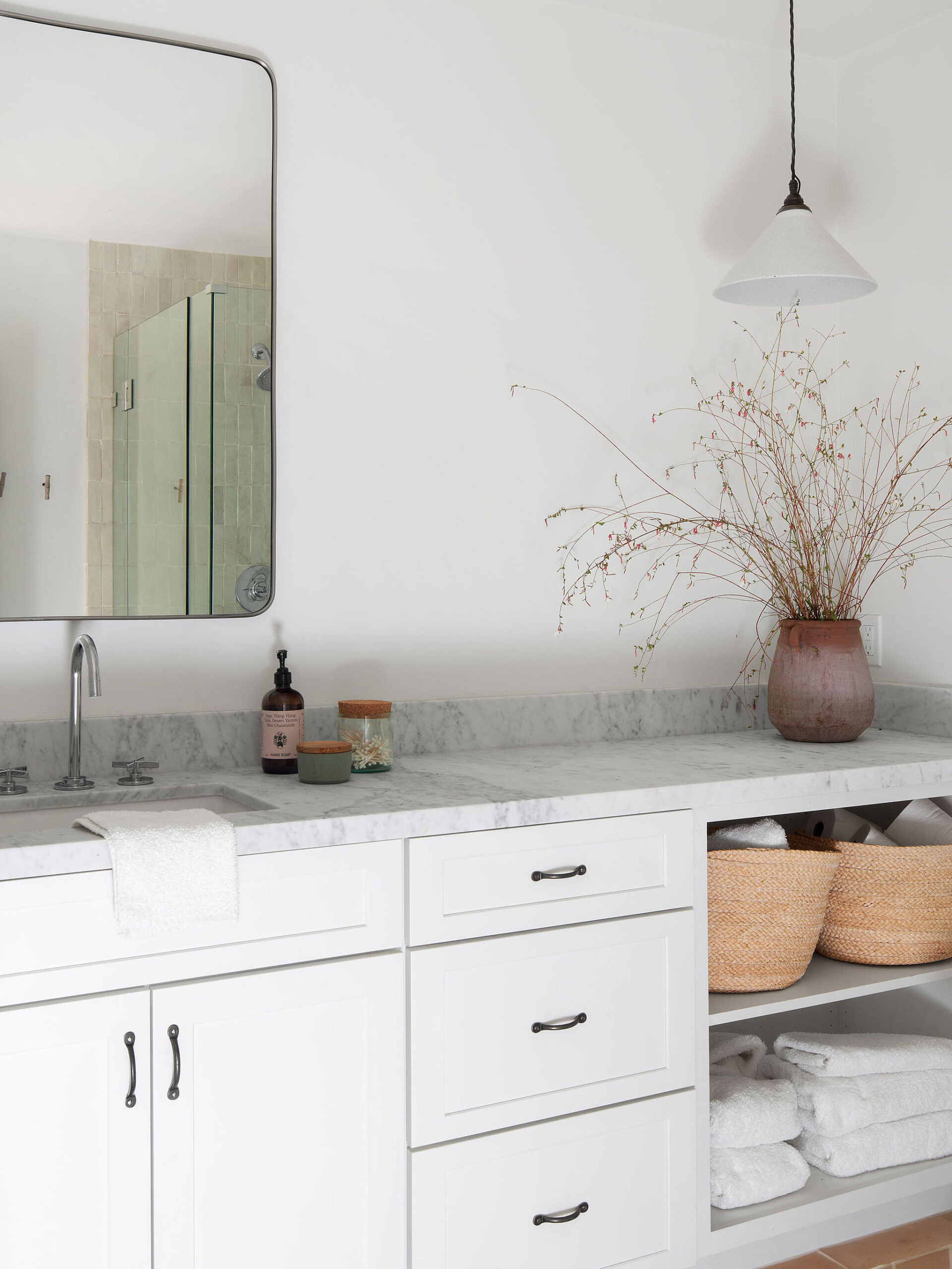 Swathing the kitchen walls in unglazed zellige tiles was a small nod to the vineyard landscape. “We really wanted it to feel organic and soulful,” shares the designer (the space was stark white before she came into the picture). The contrast of the sandy-toned baked clay with the warm white wall paneling creates the illusion that the home is decades older than it actually is—the same goes for the limestone countertops. “If you look closely, you can see small fossils in the surface,” says Donahoe.