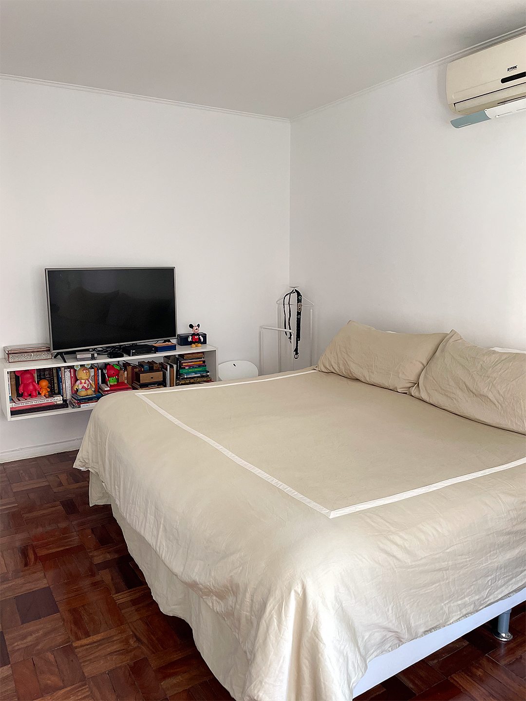 Adding depth and warmth to the stark white space was top of the priority list. The couple chose to panel their walls in Carvalho wood, a type of oak, working with architect Henrique Steyer and Florense, an interior solutions company, to bring their vision to life. “We were inspired by the wood headboards in hotels we had stayed in during our travels,” explains Zawel. Rather than just using the material as a bed frame, they took it one step further and covered the entire room in thick, unstained panels (to avoid unnecessary chemical usage).