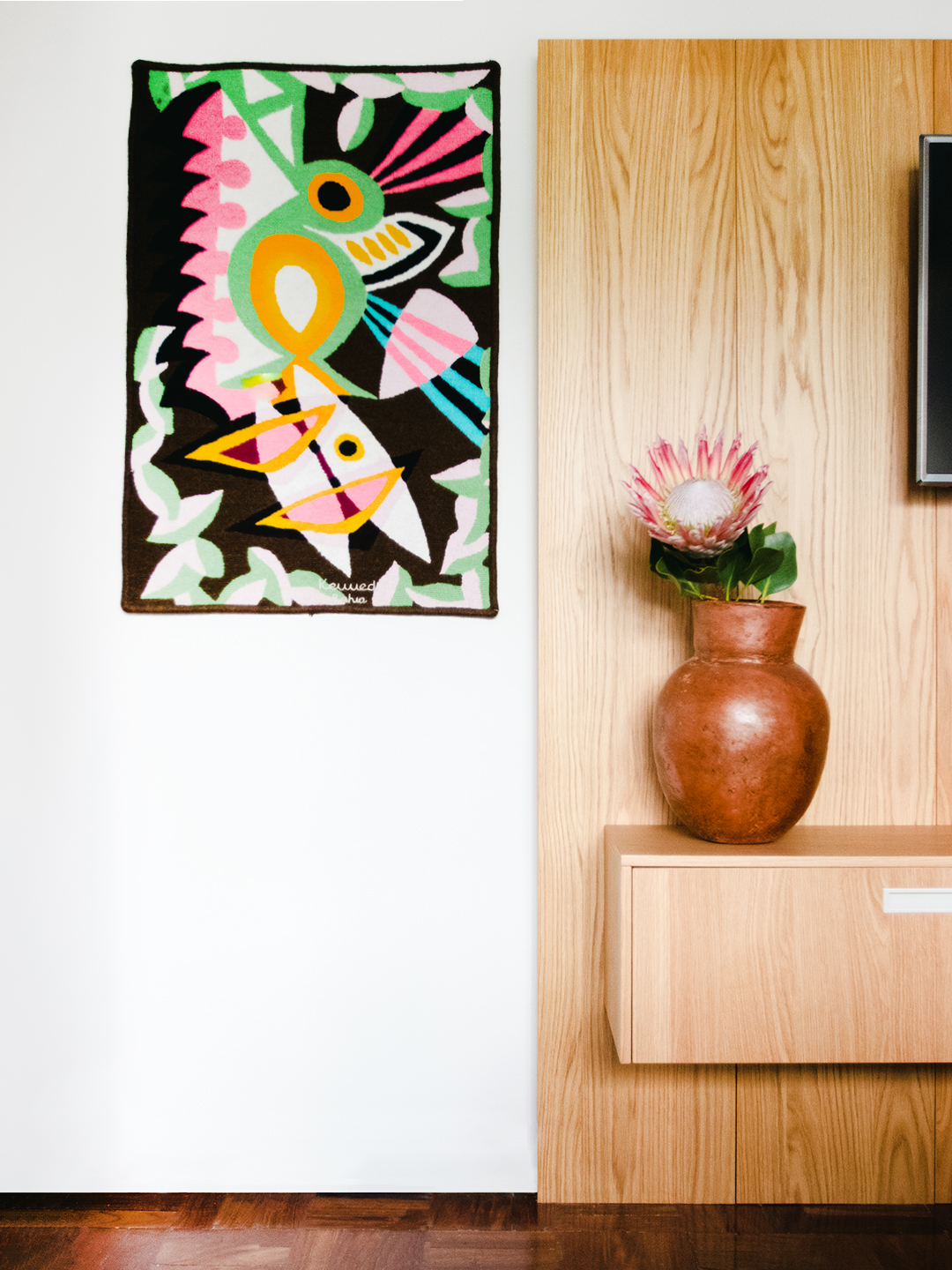 Adding depth and warmth to the stark white space was top of the priority list. The couple chose to panel their walls in Carvalho wood, a type of oak, working with architect Henrique Steyer and Florense, an interior solutions company, to bring their vision to life. “We were inspired by the wood headboards in hotels we had stayed in during our travels,” explains Zawel. Rather than just using the material as a bed frame, they took it one step further and covered the entire room in thick, unstained panels (to avoid unnecessary chemical usage).