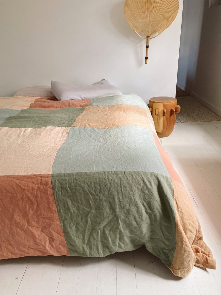 Between the sheets: I have two Parachute pillows that are extra-cozy; the one that touches my face is in a case I made out of an old silk skirt. It doesn’t absorb all the added and natural oils from my face and hair at night, and it feels great! I got our duvet from an Australian brand called Dazed But Amazed, and it’s a brilliant patchwork of linen pieces. The designer only made 30 of them, and I feel lucky to own one.