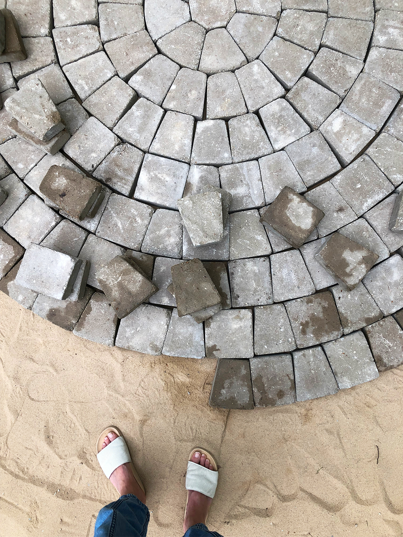 When the circle is complete, install the edging. To finish, pour sand over the entire circle. Use a broom to brush it around, filling in all the cracks between the pavers. Sweep off excess. Then add your firepit and accent furniture and get the s’mores ready!