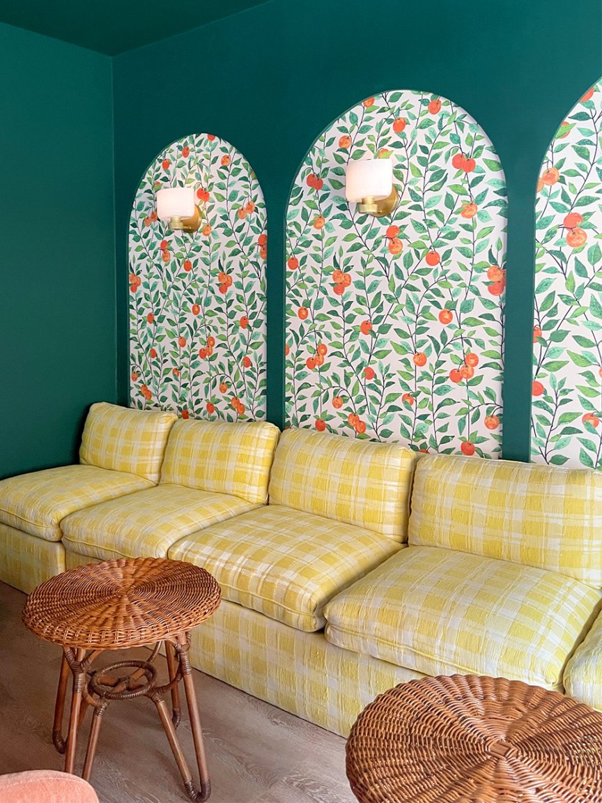 People will be flowing in and out of here, so there’s less seating to manage. One thing I did bring in was a vintage sofa I picked up at a local store in Grand Rapids. It’s a fun yellow checkered pattern that, next to the wallpaper, follows the same trend of colors found in nature. Now that this wall is done, I’m moving on to the next project: a paint treatment in the main dining area. Check in with me in February to find out how painter’s tape tricks can get you everywhere.