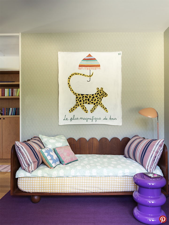 Count on Sarah Sherman Samuel to dream up a kid’s room that parents will want to move into. In the designer’s hands, a cobalt striped wallpaper wasn’t enough. She also matched the pattern’s striking blue to the half-wall paneling with a scalloped edge that wraps around the entire space like a calming wave. Now that’s a new take on wainscoting.