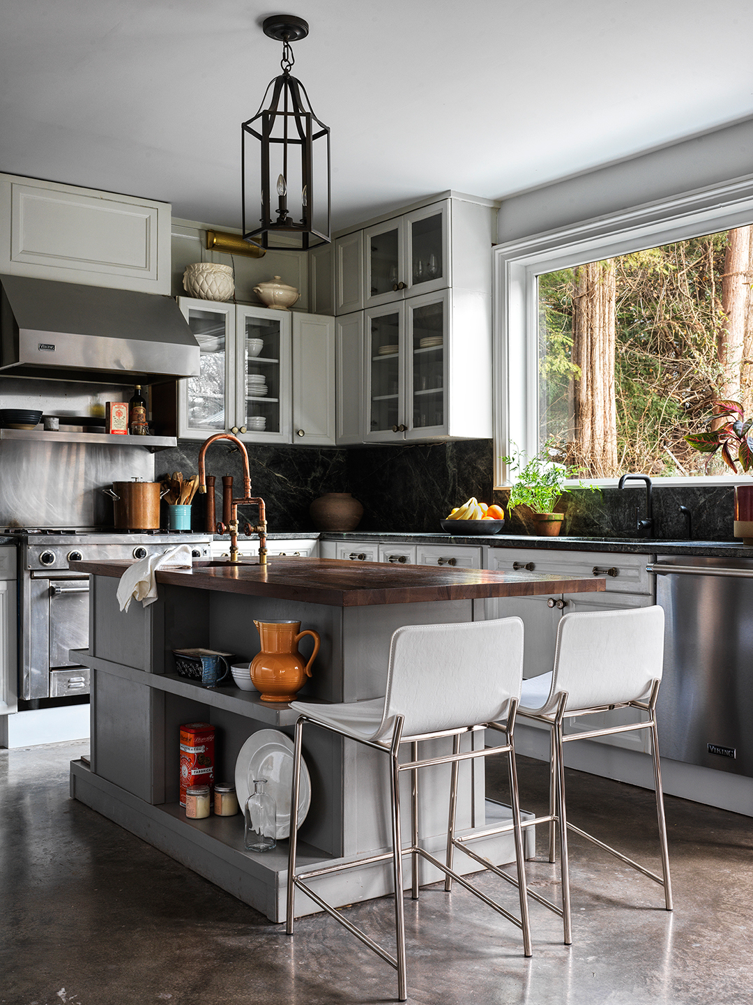 Drake’s top request was a classic farmhouse-style space (think: inky black counters, a pine butcher block island, and subway tile backsplash). But because relationships are all about compromise, Damour decided to do a riff on the rustic aesthetic and infuse a bit of her personal style, too. The main countertops, for instance, are soapstone, but the surface has hints of bronze tones in it; the island is wood, but it’s a rich walnut. “You get that feeling of elegance,” the designer says of making these small tweaks. Ahead, she walks us through the design and shares some of the smart decisions they made along the way, starting with saving big on the cabinets.