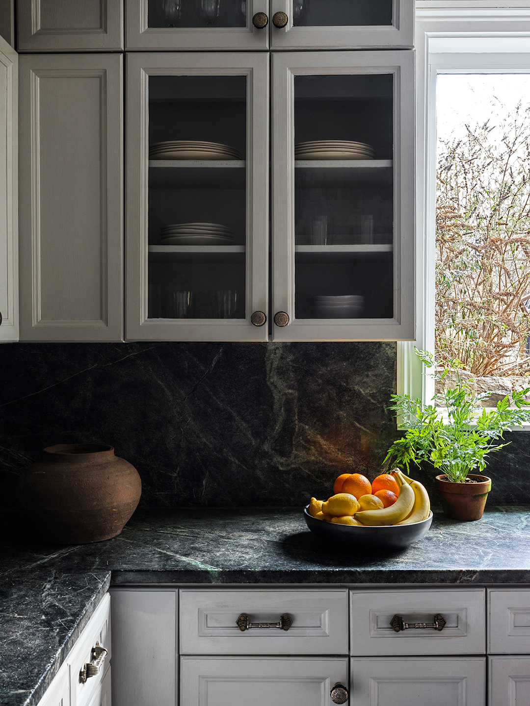 To achieve that farmhouse vibe, Damour wanted the cabinetry to almost look like furniture. As luck would have it, she found the cupboards she was looking for at Big Reuse in Brooklyn. The deeply discounted cabinets were secondhand (they were previously in another kitchen that was nearly twice the size), so Damour had to reconfigure the boxes in a way that made sense for their U-shape layout, like stacking the ones with glass fronts. Once everything was in place, she painted them in Benjamin Moore’s Stonington Gray.