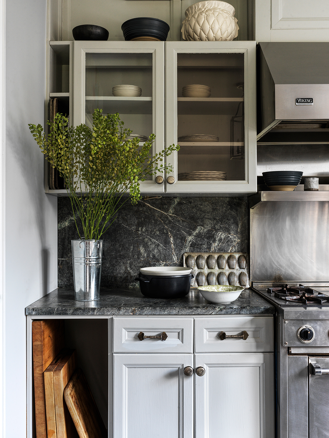 As a former chef (Damour used to run her own catering company), she also knew that having some element of open storage would be key. “Having your cooking utensils and implements out is efficient; you don’t have to waste time looking for them,” she explains. For hard-to-store, frequently used cutting boards and baking sheets, the designer squeezed two boxes on the far-left wall, one beneath the countertop and the other next to the upper cabinet.