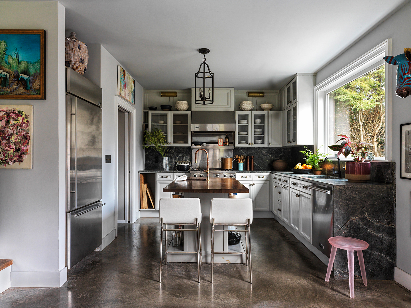 Designer Maryline Damour’s latest client happened to be her partner of 10 years, Fred Drake. “This was his house that I moved into, so I really wanted him to have the final say, more or less,” says Damour. The couple, who are also business partners (they run the building firm Damour Drake), now live together in Saugerties, New York. When Damour moved into Drake’s home upstate, which he had built from the ground up, the layout of the kitchen was pretty much in place (the appliances were there and he was getting by, storage-wise, with a few freestanding IKEA cabinets), but “it was all very makeshift,” recalls Damour.