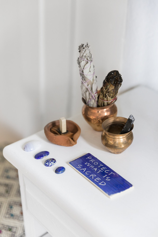 She emphasizes natural items in her home, relies on crystals and natural light to bring a sense of calm, and incorporates the aforementioned personal touches to make the space feel homey.