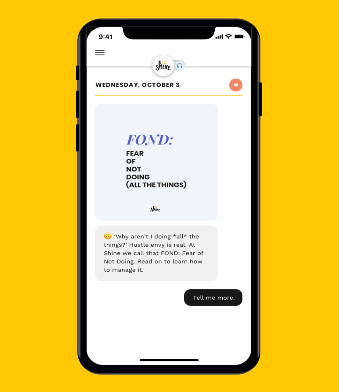 “Blocking off an hour on your calendar for ‘mindfulness’ or trying to jam a yoga class in between meetings isn’t always doable,” explain Naomi Hirabayashi and Marah Lidey, founders of the female-focused self-care app Shine. “We know you’re busy—we make self-care easy and meaningful. Our products help you check in with yourself in just a few minutes and are totally doable on-the-go.”