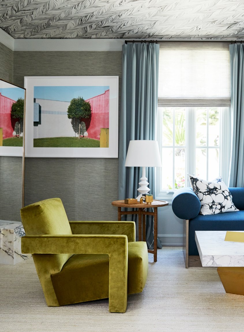 “The 8’6” ceiling was a challenge,” says Anyon Brier. “I decided to just embrace the ceiling and make it a focal point. The designer approached Paige Cleveland, the founder of Rule of Three, to create a wallpaper in a custom colorway for the ceiling to tie the space together and make the low height feel intentionally cozy. She also picked low-slung furniture that would work with the proportions of the space and make the ceilings feel higher. “We drew the furniture layout several times to make sure we captured the right scale of furniture.”