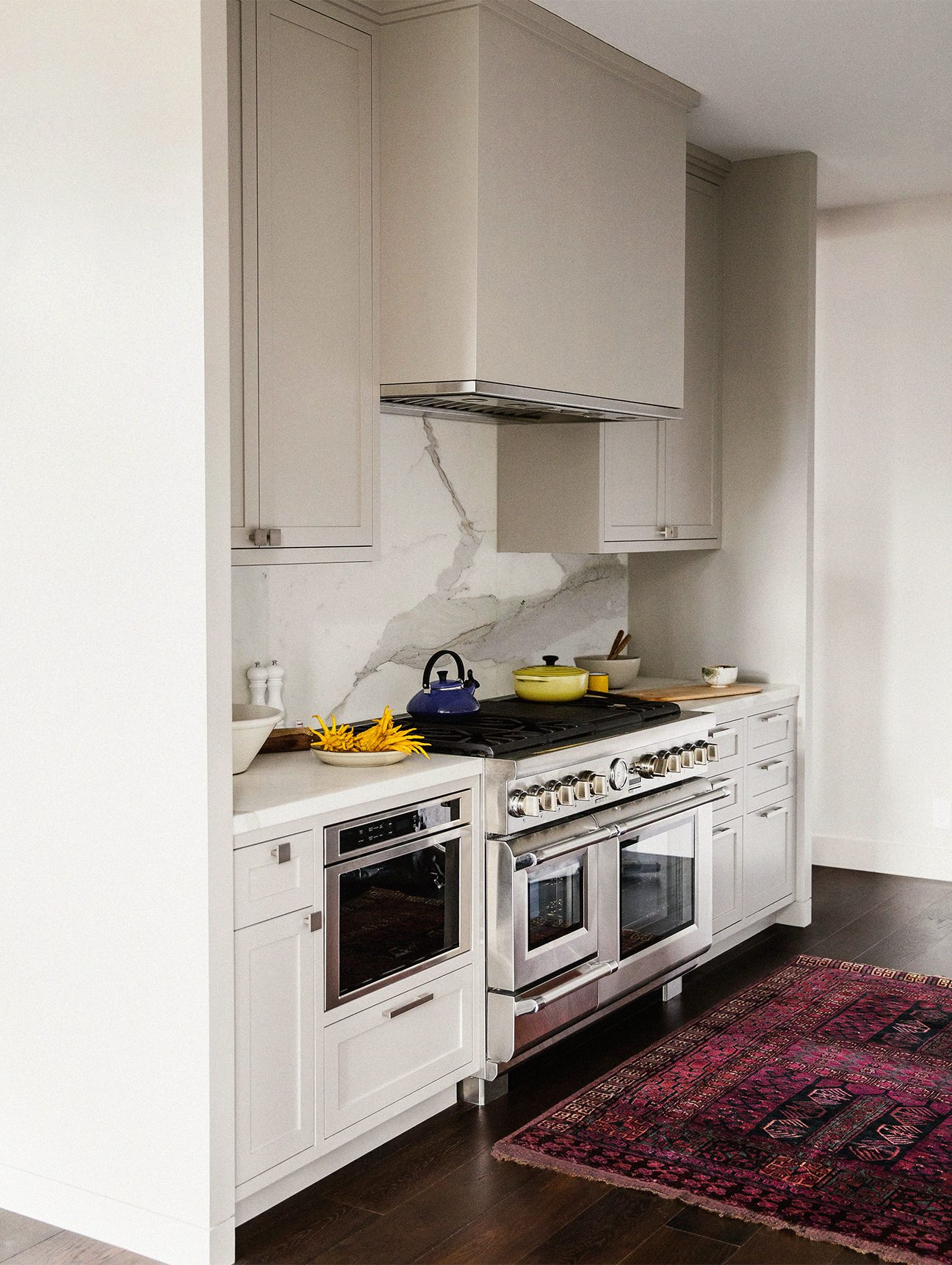 Polished nickel hardware makes this Chroma SF–designed kitchen shimmer. The sleek edges of the square knobs echo the lines of the frames of the cabinets but, like magic, a vintage rug warms up the cool, silvery tones at play.