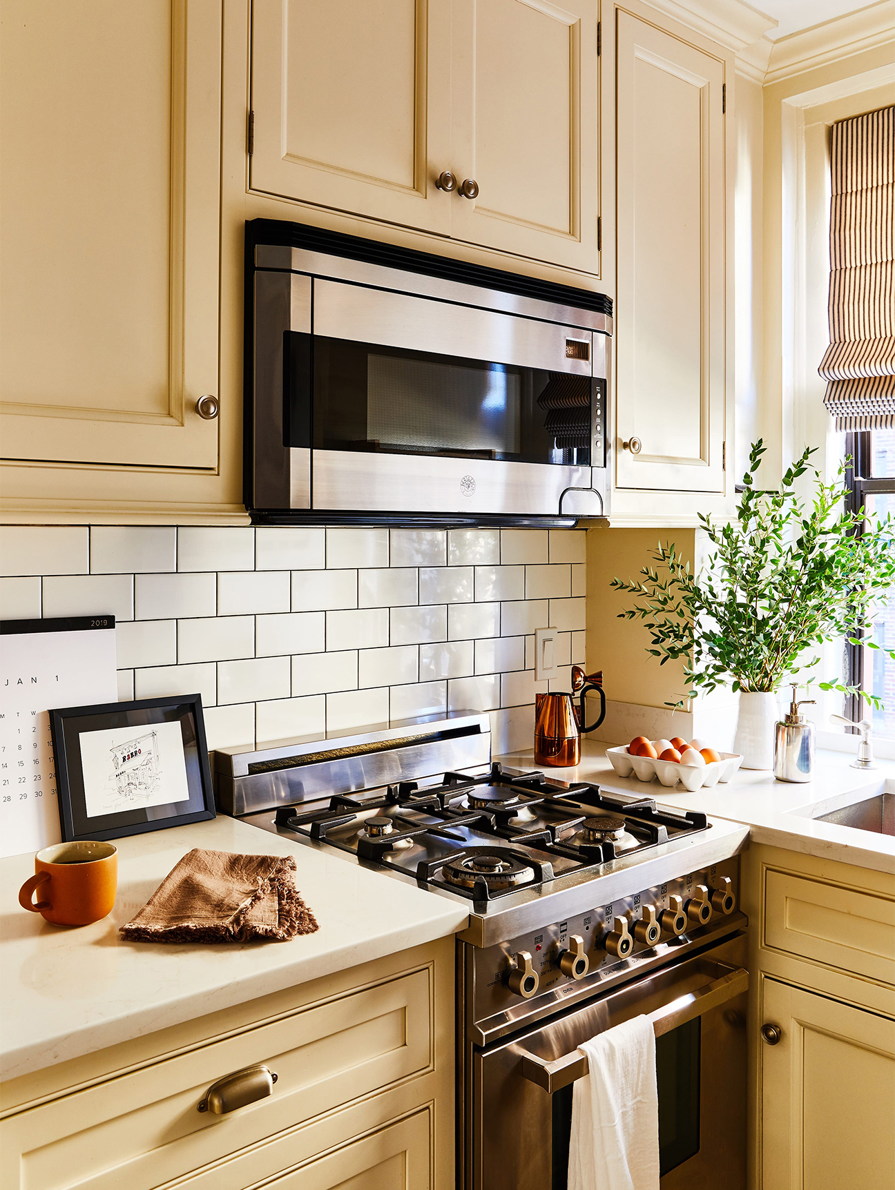 Without tearing down a full wall, Michael Geller took his teeny NYC kitchen from claustrophobic to cozy by flipping the cabinet layout 180 degrees and swathing his new custom cabinets in Benjamin Moore’s buttery White Down. The yellowy neutral exudes warmth, no matter the natural light situation.