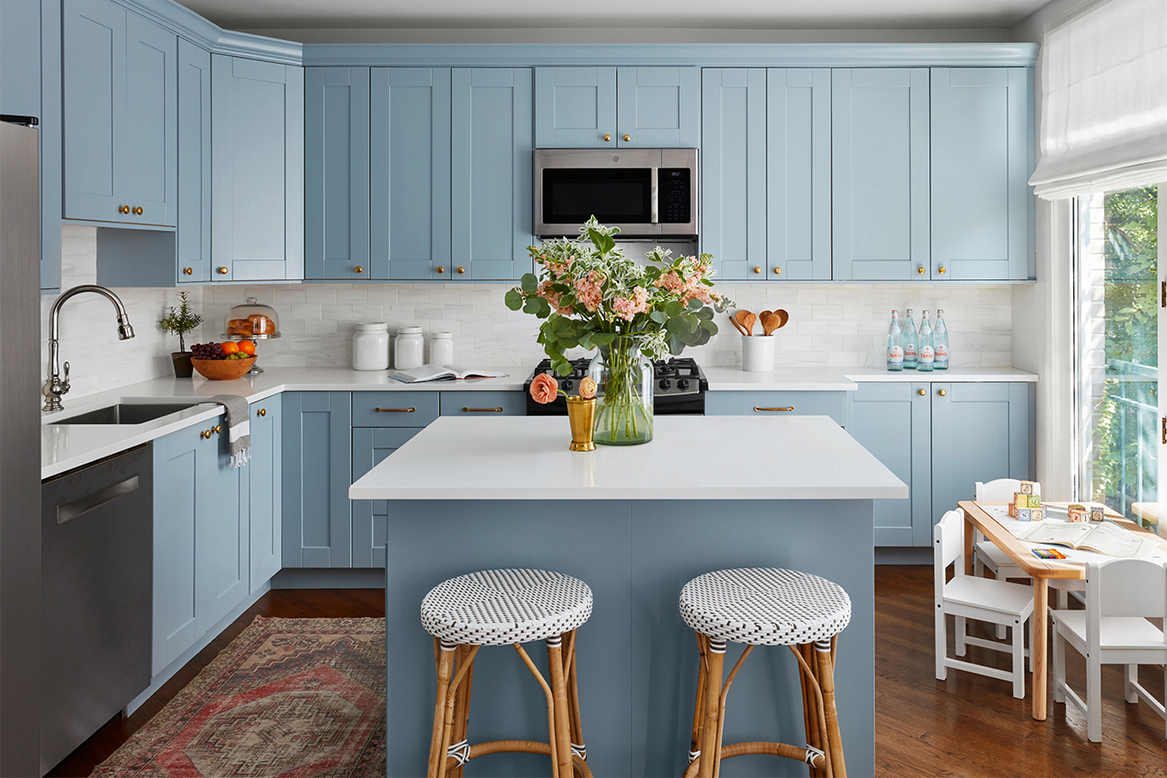 So you already have Shaker-style cabinets, but they aren’t totally your style? A lick of paint can fix that, even if they are super-dated. Designer Elizbeth Stamos spruced up her drab cherry doors by painting them in Benjamin Moore’s Solitude, a soft baby blue color. It’s also much cheaper than getting new cabinets altogether, even if you go the IKEA route (Stamos saved $35,000 by sticking with the ones she had).