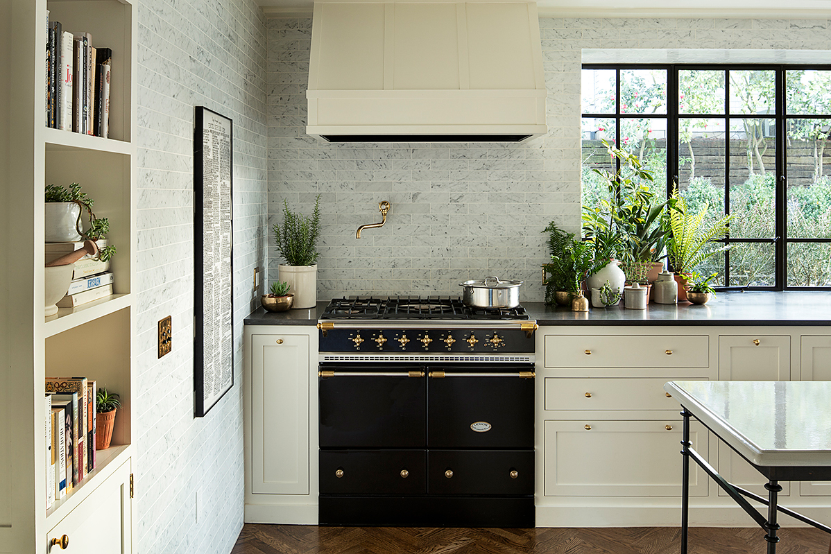 In this no-nonsense kitchen, designed by Jessica Helgerson, even the hood is Shaker inspired (peep the detailing in the center that looks like stiles). Marble subway tiles that stretch from floor to ceiling and a jet-black Lacanche range make for an all-around sophisticated space.