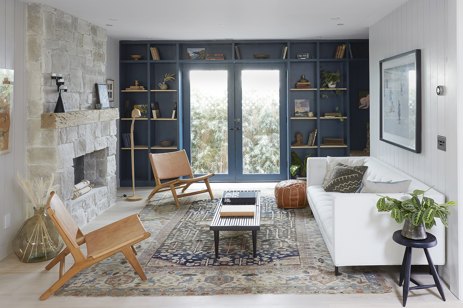 When I first walked into the house, the layout was very closed off, with small, dark living spaces—it was uninspiring, uninviting, and lacked a sense of flow. My goal: to make it feel more spacious by knocking down walls and opening up the front den to the dining area, the kitchen, and the living room. I added the stone fireplace for a warm and cozy feel and built bookcases to frame the French doors, a detail I had always wanted to include in a project. Together with the fireplace, it makes for the ultimate reading nook.