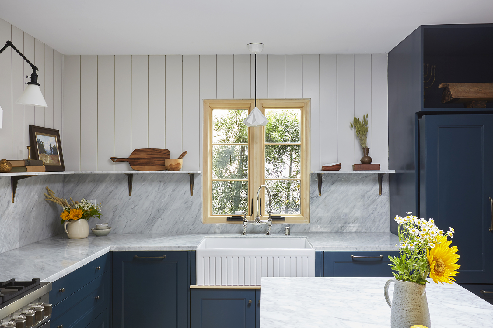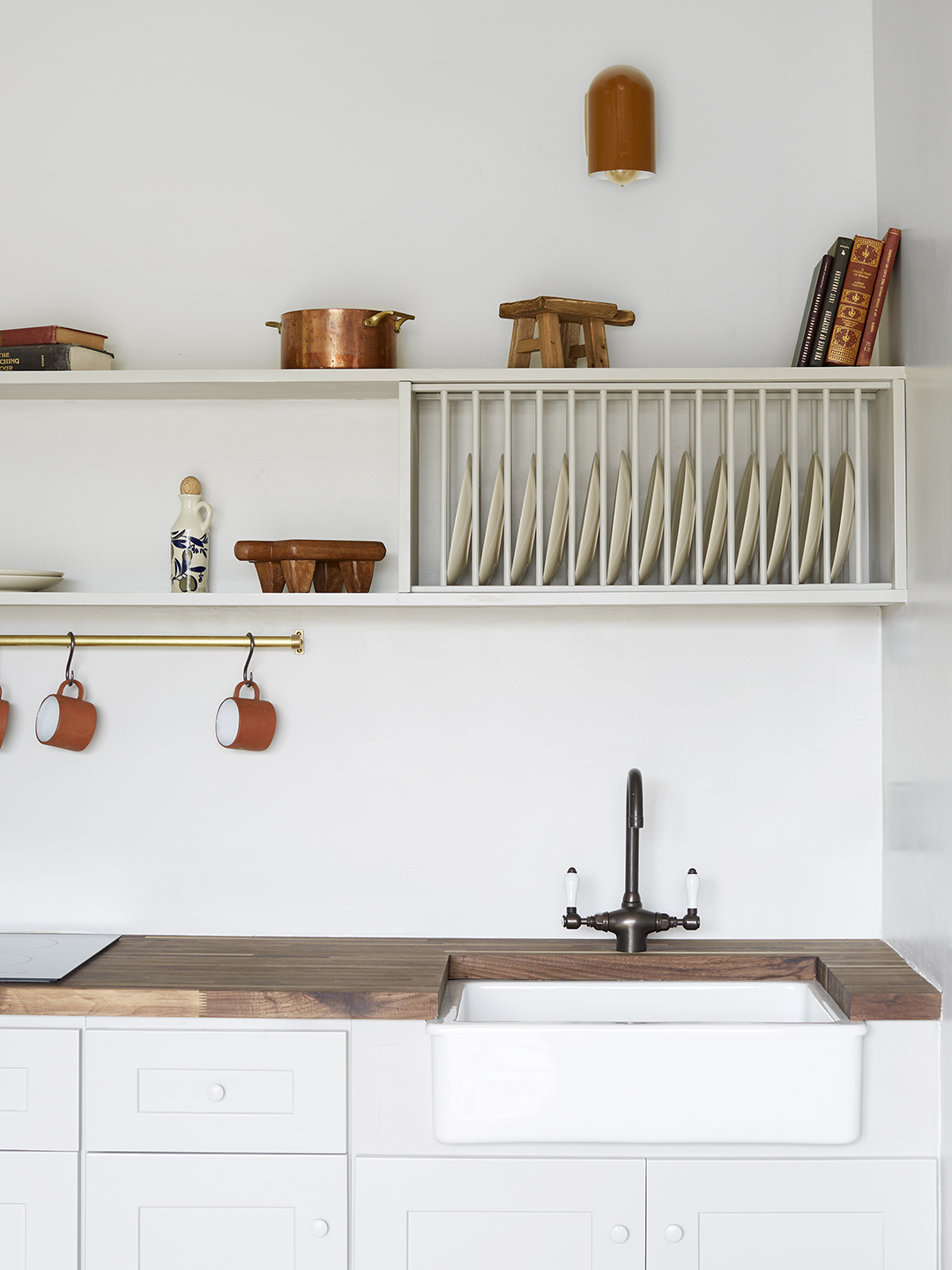 The kitchenette was inspired by English cottages, to make guests really feel like they’re on vacation. I used open shelving but added custom details like a plate rack and hanging brass rail to optimize storage—British kitchens typically have these details, which I love.