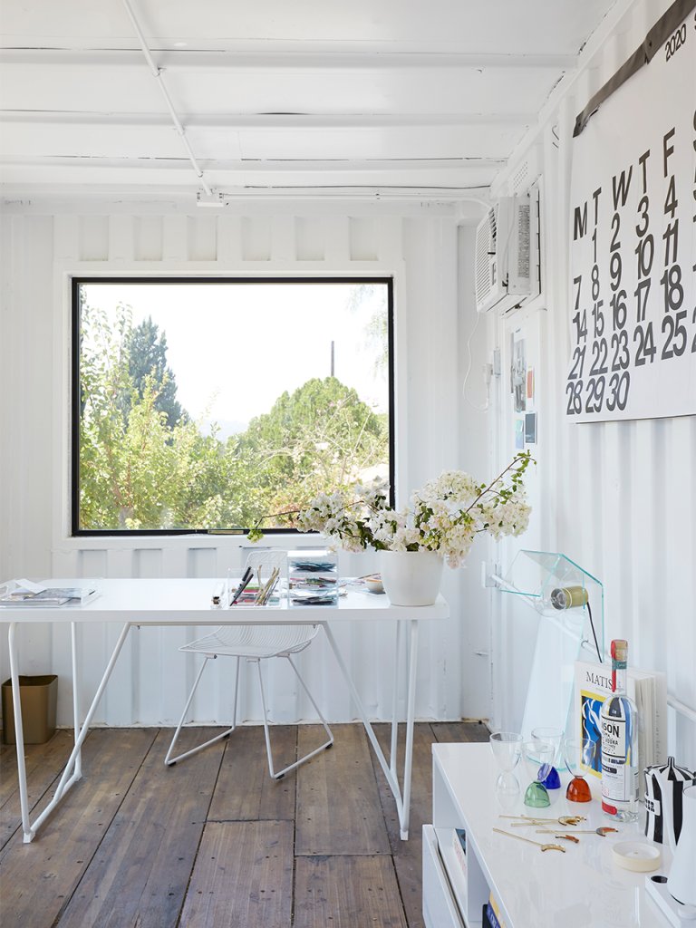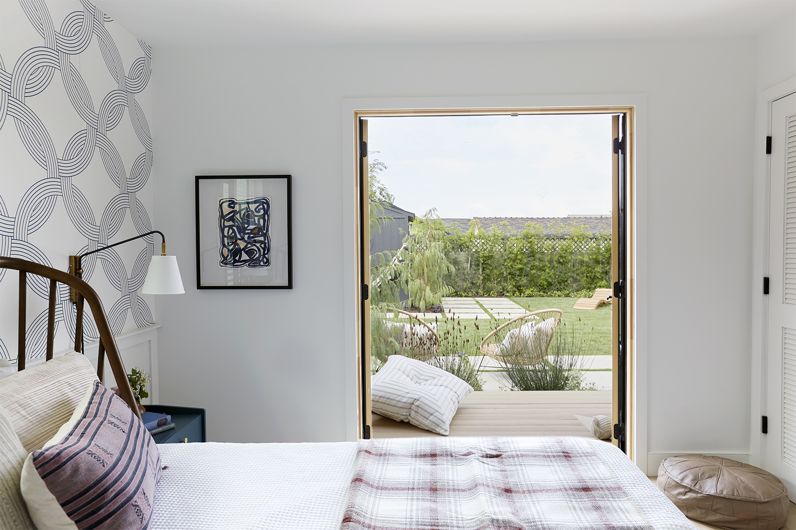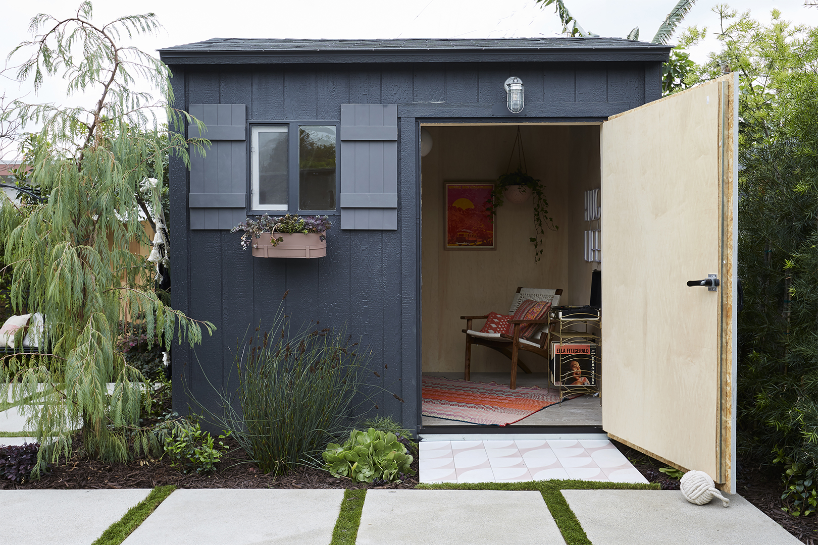 In the back of the yard, we added a shed to create a flexible area to be used as an art or yoga studio—or just a place for “me time.” The backyard is big and this spot enhances the home’s indoor-outdoor living. I wanted to infuse the space with a cabin vibe, so I covered the walls in maple-wood panels, which were more expensive than regular drywall but worth it for their character.