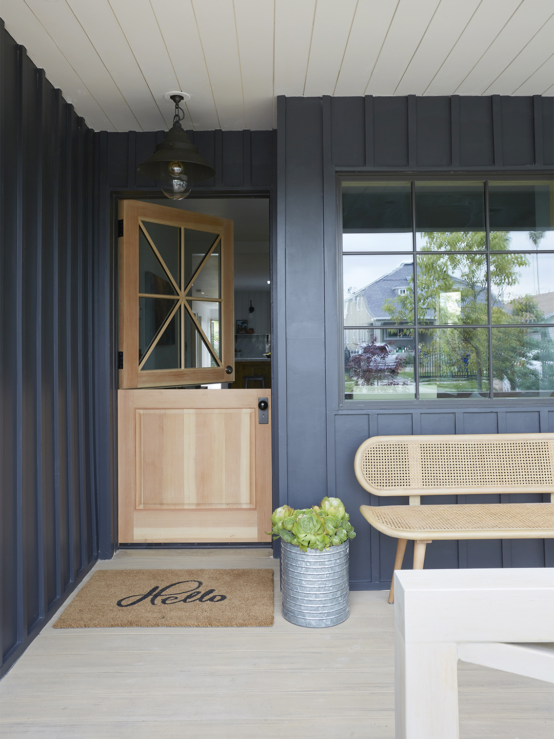 Outside, we added board and batten siding, Dutch doors, lighting, pergolas, and custom-made gates (they’re made of wood, so they become part of the curb appeal). We were going for an eclectic, laid-back, California-cool look. We also added a sizable back porch and a side yard walkway to create an indoor-outdoor entertaining space. I wanted to make the house feel wider and bigger from the outside while also keeping it intimate, and infuse the yard with different textures and colors through plants and flowers.